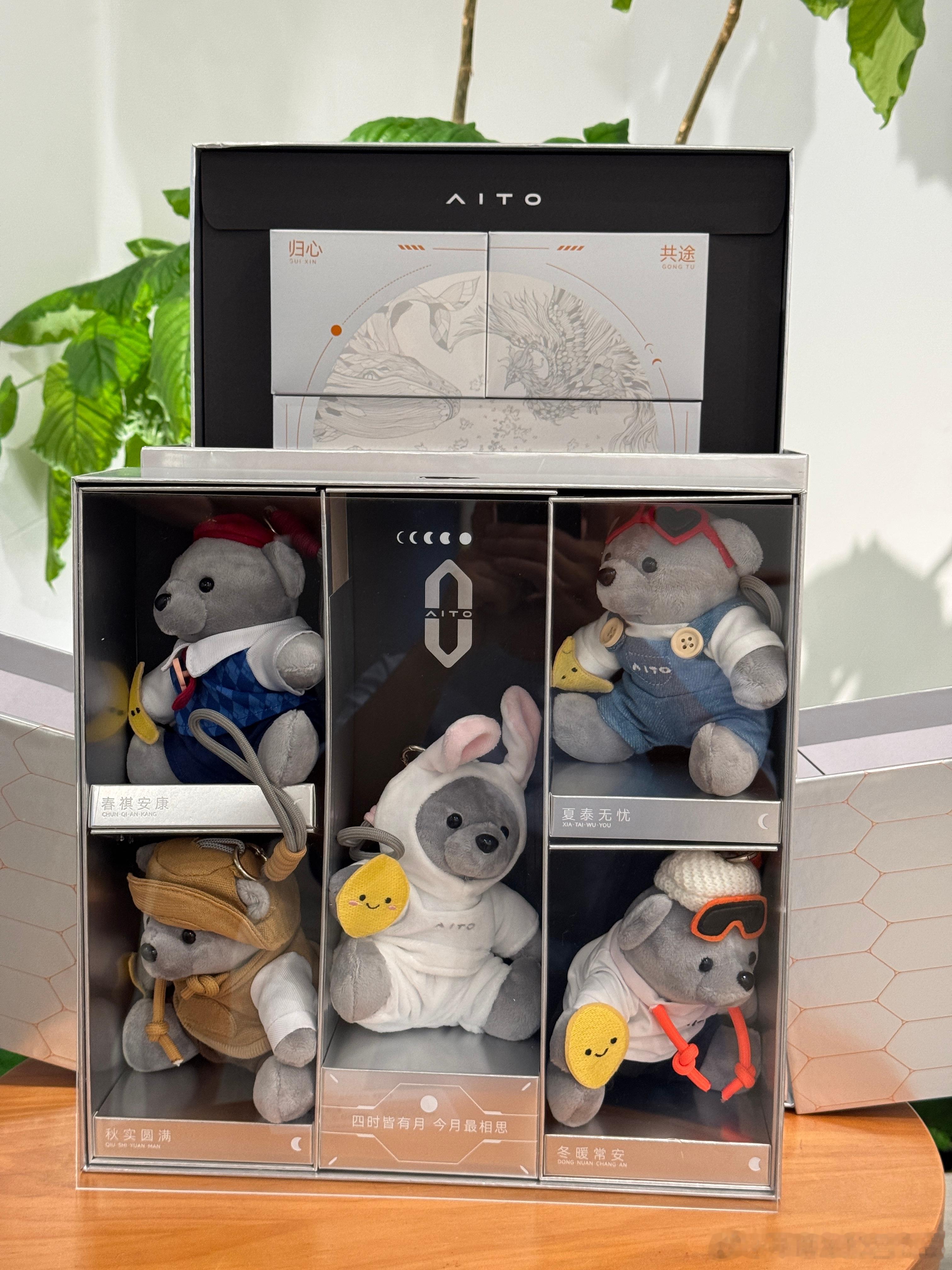 每一年收到的月饼礼盒我很少留下,都是送人,我们家人也不爱吃月饼。但是这次的礼盒我决定留下了,女儿太喜欢了,在她心中有代替Labubu地位的存在了,毕竟她爹实力有限,只给她买了两个Labubu,这次AITO熊组团来了