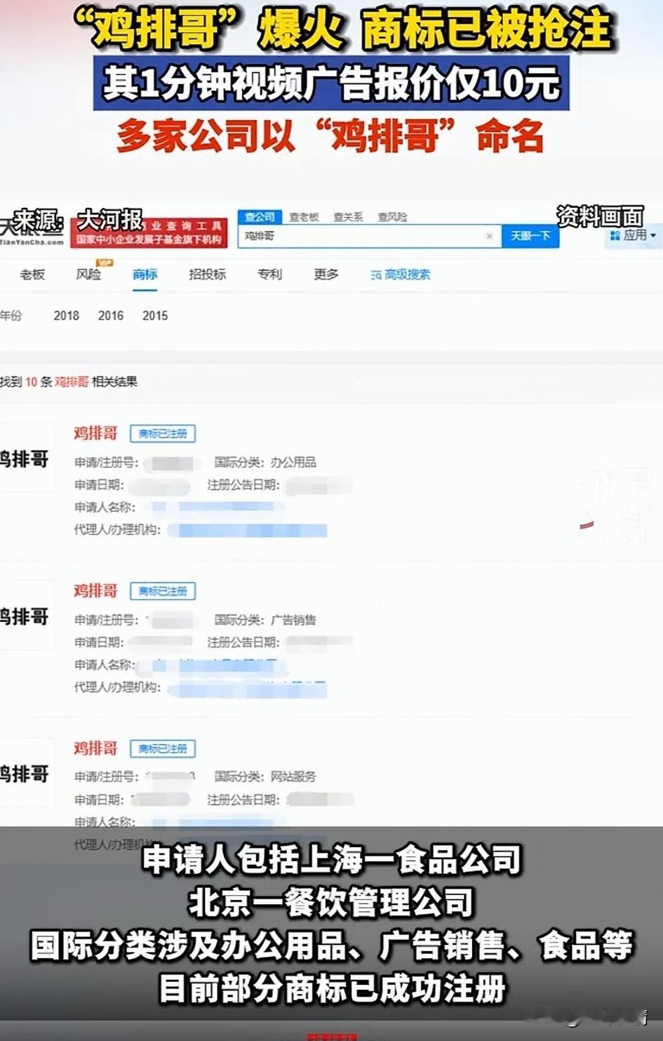 鸡排哥走红后恶心的一幕出现了, 天眼查上面出现了很多鸡排哥命名的公司和小吃炸鸡店, 这些人还梦想着可以蹭鸡排哥流量生意就能好点, 说他们傻的他们都知道抢注商标, 说他们的聪明吧他们是真的蠢, 人家鸡排哥走红是因为人, 他们以为人家炸鸡排🔥是因为鸡排哥的名字,有时候还真是聪明反被聪明误, 不知道这些公司和小店到时候能把注册费挣回来吗? 以为有了这个鸡排哥的商标可以拿捏鸡排哥,做梦吧! 即使人家不用鸡排哥的名字照样可以火,因为大家只认这位大叔, 人家不用鸡排哥的名字照样有人买账, 不信大家拭目以待! 大家对于多家餐饮公司和小吃店抢注鸡排哥商标怎么看? 鸡排哥 鸡排哥景德镇 鸡排哥 小哥鸡排