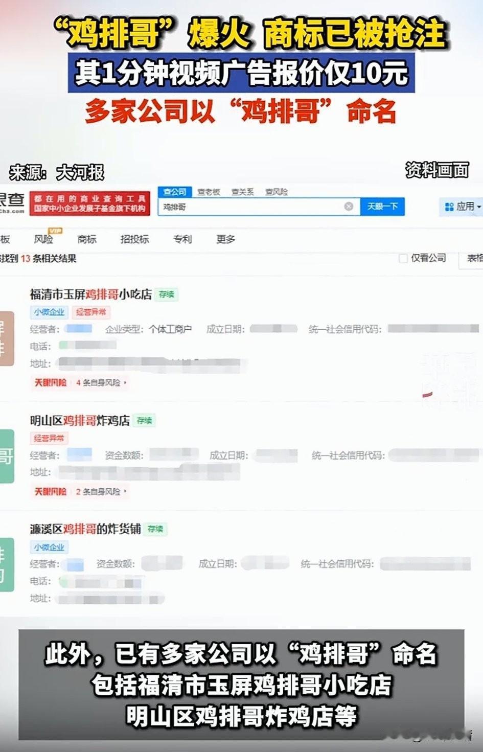 鸡排哥走红后恶心的一幕出现了, 天眼查上面出现了很多鸡排哥命名的公司和小吃炸鸡店