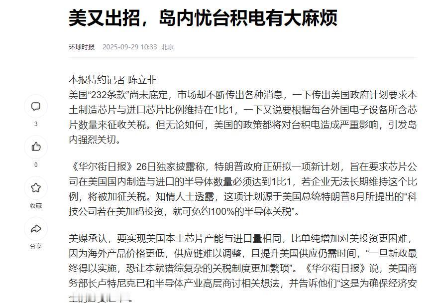 美国为啥怕中国收复台湾?不夸张的说,只要中国收回台湾,美国就得从霸主位置滚下来。说白了,单单一个台积电就会影响深远,一旦中国收复台湾,那么台积电将会成为,中国芯片发展的一大助力。   先给大伙说点实在的,现在全球半导体产业里,7纳米以下的先进制程,就是绝对王牌,谁攥着谁就有话语权。而能稳定造3纳米芯片的工厂,全世界找遍了也就台积电在台湾有一家,独一份的生意,别人想学都学不来。   再看5纳米芯片,台积电一家就占了,全球60%以上的产能,连韩国三星拼了老命追,良率都比它差一大截。啥叫良率?就是造100颗芯片里能合格用的数量,三星造5纳米可能100颗里就60颗能用,台积电能做到85颗以上,这差距可不是一星半点。   就这产能和技术,美国那些吹得震天响的科技巨头,没一个离得开。高通的5G芯片,咱们现在用的安卓手机十有八九都靠它,可高通自己造不了,全得靠台积电代工;英伟达更不用说,现在全球AI热得发烫,它家的H100芯片是AI算力的核心,而这芯片90%的产能都被台积电攥着。   去年英伟达为了抢产能,差点跟苹果闹僵,更关键的是美军的特种芯片,比如战斗机上的雷达芯片、导弹里的制导芯片,对稳定性要求极高,只有台积电的制程能满足,美国自己想造都没这本事。   有人可能会问,美国不是科技强国吗?咋连芯片都造不了?说起来也挺讽刺,早几十年美国确实能造,可后来觉得造芯片又脏又累,还不怎么赚钱,就把产业链中下游的制造、封装、测试全扔给了亚洲国家,自己一门心思搞设计和金融。   结果这么多年下来,美国半导体制造的份额,从1990年的37%,*暴跌到2020年的12%,现在连生产芯片用的高纯度硅片,都得从日本进口,光刻胶靠韩国,电子气体看德国脸色,典型的“把鸡蛋放别人篮子里”,现在想拿回来,晚了!   美国政府也不是没意识到问题,前两年推出《芯片与科学法案》,砸了几百亿美元,逼着台积电去亚利桑那州建厂,号称要搞2纳米和3纳米生产线,还吹“要让美国重新掌握芯片制造”。可实际情况呢?   台积电美国工厂的建设成本,比台湾高4倍,当地根本找不到,会操作EUV光刻机的工程师。这机器是造先进芯片的核心,全球就荷兰ASML能造,操作起来比开战斗机还复杂,美国本土培养的人连开机都费劲,最后还得从台湾调技术团队过去。   更绝的是,台积电现在的产能,早就满负荷运转了,连续两年产能利用率超过90%,3纳米和5纳米产线更是接近100%,客户想下单都得排队。去年苹果为了抢3纳米芯片给新iPhone用,直接包下了台积电50%的3纳米产能,把英伟达、AMD这些老客户挤得够呛,英伟达差点因为没产能耽误了AI芯片的交付。就这抢手程度,台积电说是全球半导体供应链的“太上皇”都不为过,美国想跟它掰手腕,先问问苹果、英伟达答不答应。   还有个点美国更怕,就是中国手里的稀土牌。全球90%的稀土加工产能都在咱们这儿,而制造芯片的抛光垫、靶材这些关键材料,都离不开稀土。要是美国敢在台积电问题上玩火,比如断供台积电的设备,咱们反手就能掐断稀土供应,到时候美国的半导体工厂就算有设备,也没原材料开工,这招叫“以彼之道还施彼身”。美国自己尝过“卡脖子”的滋味,现在轮到它怕被别人卡,能不慌吗?   不过得说清楚,中国收复台湾,根本不是为了“抢”台积电,而是为了实现国家的完全统一。这是中华民族的核心利益,谁也拦不住。至于台积电,它本来就该是连接两岸产业链的桥梁,而不是美国手里要挟中国的“人质”。   现在两岸半导体产业各有优势,大陆有完整的中低端芯片制造链条、庞大的市场,台湾有先进制程技术,一旦统一,两岸联手搞半导体,既能突破美国的技术封锁,还能让全球产业链更稳定,这才是互利共赢的好事。   美国现在还抱着冷战思维,觉得靠垄断技术就能维持霸权,简直是异想天开。这些年它打压华为、制裁中芯国际,以为能拦住中国半导体发展,结果呢?华为硬是搞出了麒麟芯片,中芯国际也突破了14纳米制程。如今时代变了,全球化的今天,没有哪个国家能靠垄断技术长久当老大,美国要是还不醒悟,早晚得被时代甩在后面。   最后送美国一句实在话:别再拿台积电当借口折腾台海了,中国统一是历史必然,谁也挡不住。美国要是识相,就该早点放弃遏制中国的念头,不然最后只会搬起石头砸自己的脚,到时候可别哭着喊着求合作。 参考资料:环球时报