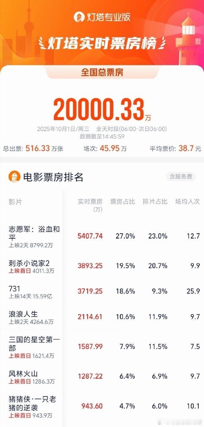【2025国庆档首日票房破2亿】据灯塔专业版,截至10月1日14时46分,202