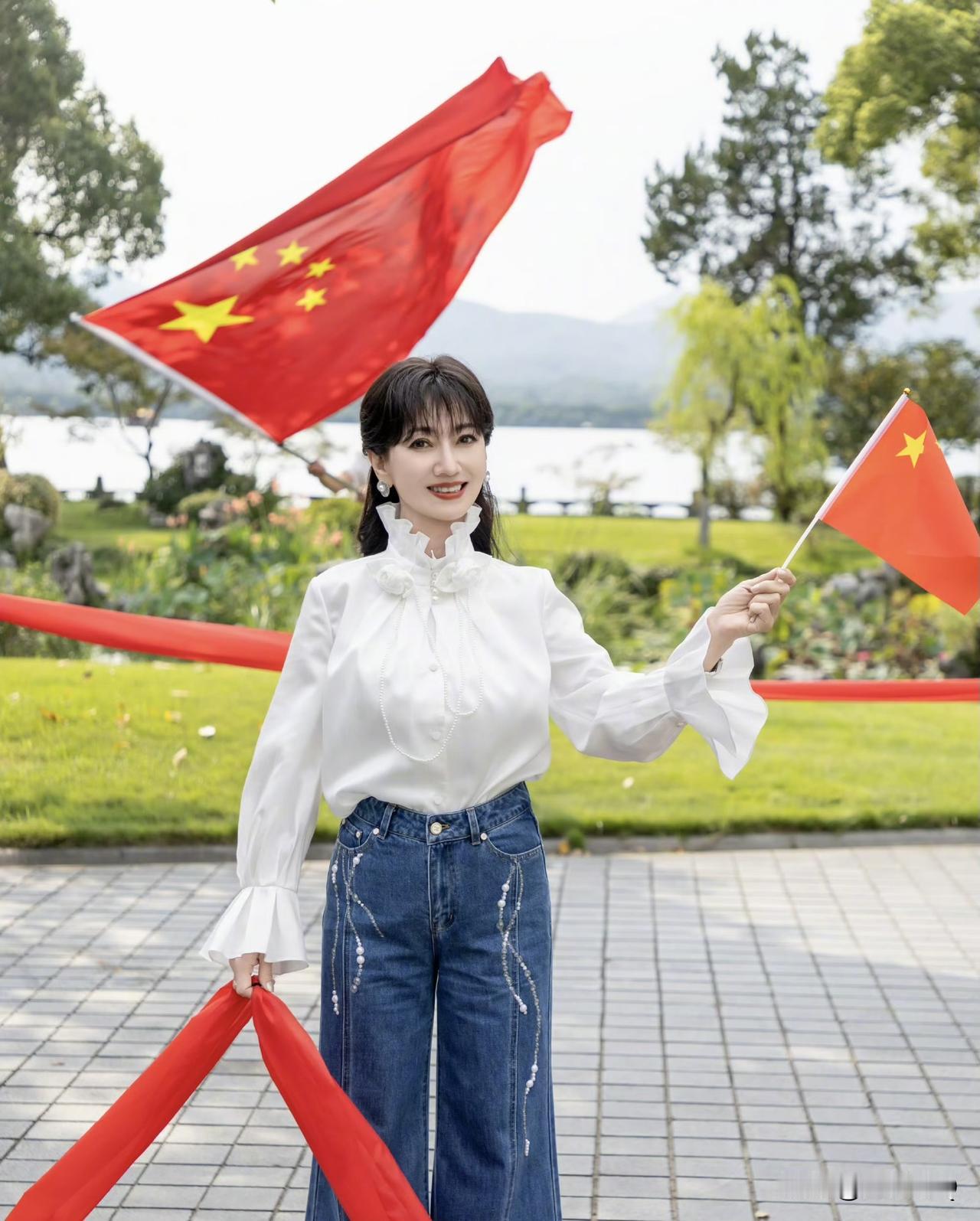 赵雅芝喜迎国庆,和团队小伙伴用丝带摆五角星造型,这创意真不错。