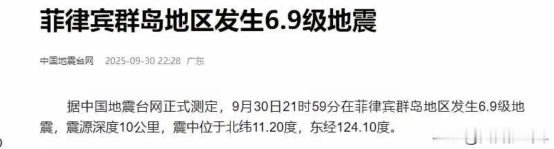 9月30日,菲律宾爆发地震,美日澳网友期望中方救援! 9月30日晚,菲律宾中部海域的一阵剧烈摇晃打破了夜晚的平静,6.9级强震突如其来,震源深度仅5公里,浅源地震的破坏力迅速蔓延开来。 震中位于宿务省博戈市周边海域,三百公里范围内的十六座大中城市都感受到了强烈震动,宿务省一座教堂在摇晃中垮塌,博戈市的快餐连锁店和圣雷米西奥镇的体育馆也相继坍塌,成为主要伤亡现场。 地震发生后,菲律宾火山地震研究所立刻发布海啸预警,提醒莱特省、宿务省等多地民众远离海滩,海上船只前往深海区域避险,这一预警在10月1日凌晨才正式解除。莱特省、萨马省等区域的电力供应中断,伊洛伊洛省宣布停工,宿务市、拉普拉普市等多地宣布停课,全力排查建筑安全隐患。 截至10月1日中午,宿务省救灾部门通报的死亡人数已上升至64人,另有上百人受伤,博戈市的医院里伤者不断涌入,医护人员面临巨大压力。更让人揪心的是,震后还引发了连锁反应,距首都马尼拉50公里的塔尔火山发生小型蒸汽喷发,喷流高达2500米,不过未对灾区造成直接影响。 灾情传来,国际社会的目光纷纷投向这片受灾的土地。美国网友在社交平台留言,期盼没有中国同胞受伤,祝愿灾民早日康复。来自日本、澳大利亚的网友也持续关注救援进展,不少人提及希望中国能伸出援手。 事实上,中国早已行动起来,中国驻菲总领馆第一时间提醒在菲公民防范余震,暂未接获中国公民伤亡报告,外交部也明确表示愿根据菲方需求提供全力支持。这样的响应并非首次,1990年碧瑶大地震时,中国的急救物资就曾最早送达灾区,温暖了当地民众。 目前,宿务省已宣布进入灾难状态,菲律宾总统召开紧急会议调配救援力量,五百多名志愿者投入救灾,联合国也表示将提供帮助。 救援队伍在废墟中争分夺秒搜寻幸存者,物资正设法跨越受损的桥梁和开裂的道路送往灾区,各方力量正凝聚成救灾的暖流。