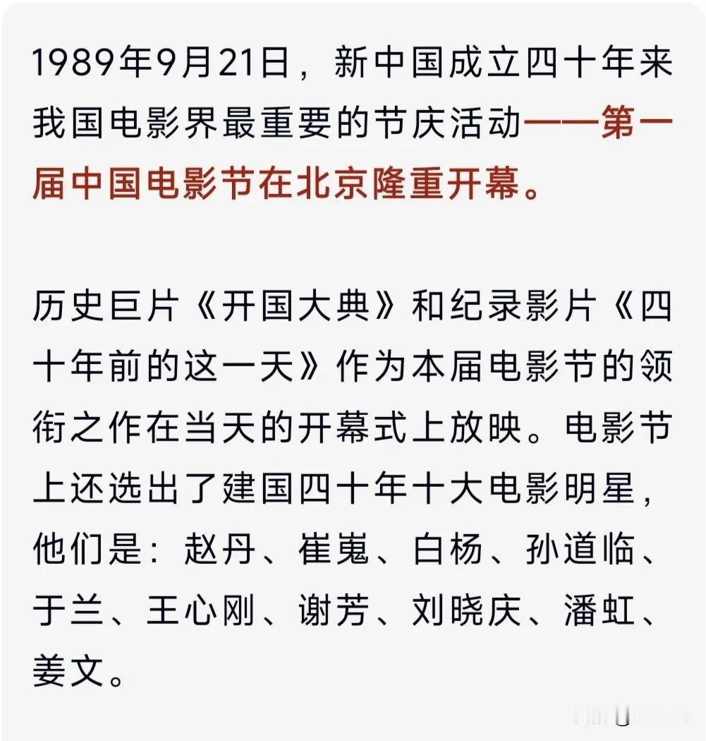 建国四十年十大明星:赵丹 崔嵬 白杨 孙道临 于蓝 王心刚 谢芳 刘晓庆 潘虹 姜文 这次评选是官方评的,有权威性 看了名单有几个印象, 各厂平衡性做到了, 男女比例均衡也做到了, 老中青兼顾也做到了, 其实评十个比评二十个难度大得多 这名单北影女演员大胜,老中青三代都有人入选,上影名旦一大堆,只一个入选 如果不考虑男女比例,八一厂入选的会否是田奶奶? 感觉这名单很难改动一点点 如果我投票,我会上王晓棠,替代谁?不好说 记得有人跟谢芳说过这个奖可能是你最高的奖了,谢芳也没同意,后面的事谁知道呢?果然,后面电影百年谢芳得了更有分量的电影奖,“世纪奖”“杰出贡献奖”