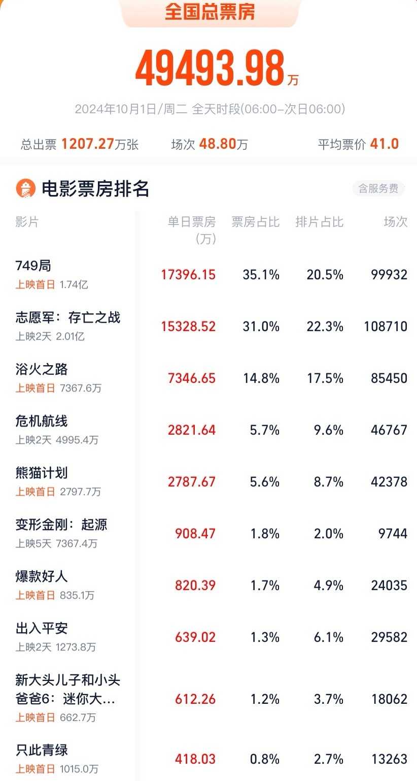 去年国庆档首日票房大盘是五亿,票房日冠是电影《749局》,而今年1号大盘票房只有