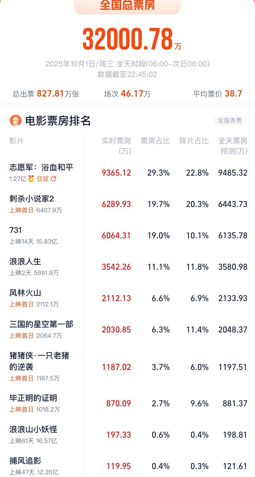 去年国庆档首日票房大盘是五亿,票房日冠是电影《749局》,而今年1号大盘票房只有3.2亿,退步太大了。 ​​​