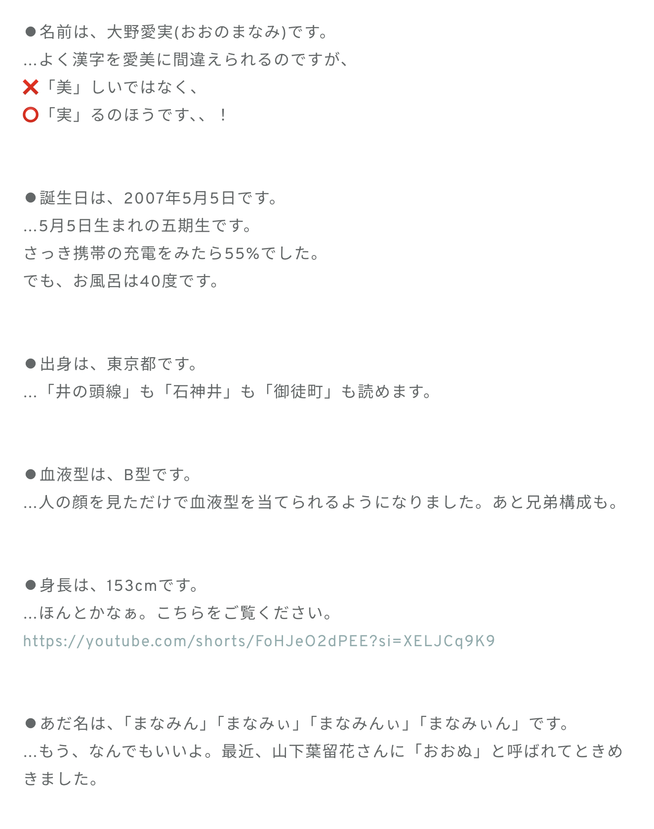 大野愛実「自己紹介します!………と言いたいところなのですが、リレーブログのいちばん最初の回で自己紹介をしていましたねっ。だがしかし。あれはもう5ヶ月前の情報なんですよ。17歳11ヶ月の大野愛実ちゃんと、18歳4ヶ月の大野愛実さんでは、そりゃあ細胞の一つくらいは変わっててもおかしくないわけで。今日はあの頃のブログに添削しつつ自己を紹介します。」