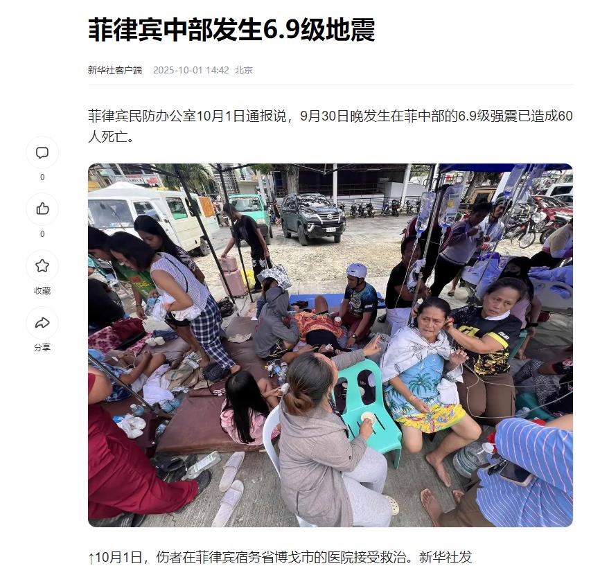 9月30日,菲律宾爆发地震,美日澳网友期望中方救援! 当晚21时59分,菲律宾宿务岛与莱特岛之间的海域,发生6.9级强震,震源深度仅10公里,而连远在马尼拉的居民,都能感觉到桌椅剧烈晃动。短短一天时间,这场地震就把菲律宾拖进了地狱: 死亡人数从最初的26人飙到60人,宿务省博戈市一半的房子,塌成了瓦砾堆,30条人命被埋在废墟里,救援人员用手扒了十几个小时,指甲缝里全是血;麦德林市两座大桥断成几截,钢筋像麻花似的翘在半空,塔博贡镇的公路裂得能塞进脚掌,救援车堵在城外进不去,只能靠村民背着药品徒步往里冲。 更要命的是,余震已经来了795次,气象局每隔半小时就发一次海啸预警,海边的村民抱着孩子往山上跑,不少人连家当都没来得及拿,只能在山顶冻得瑟瑟发抖。 这时候最该冲在前头的美日澳,却集体玩起了“隐身术”。美国倒是发了个慰问声明,可捐的钱只有1380万比索,折合成人民币才170万。日本更离谱,承诺给500万美元的救灾物资,结果卡在海关没动静,理由居然是“要核查是否涉及军事用途”。合着菲律宾人在废墟里等着救命,他们还在慢悠悠地走流程。 澳大利亚更绝,连句像样的安慰都没有,官方账号发了条“关注菲律宾灾情”的推文,底下连配图都没有,评论区全是本国网友骂街。 反倒是中国,没说太多漂亮话,却干了最实在的事。中国驻菲律宾使馆凌晨两点,就发了领事提醒,把在菲华人的避难地点、求助电话列得清清楚楚,还开通了24小时热线,工作人员轮流守着电话,生怕漏接一个求助。 在菲的中资企业更不含糊,建筑公司调出了挖掘机、起重机,直接开到灾区帮着扒废墟;手机厂商临时搭了充电棚,让灾民能给家里报平安;连中餐馆都煮了热粥,一碗碗递给冻得发抖的村民。 这画风是不是特别眼熟?2013年台风“海燕”扫过菲律宾的时候,比这次还惨,627万人无家可归,塔克洛班市整个被海水淹了,美国捐的钱跟这次差不多,日本的净水设备扣在海关半个月,最后还是中国救了急。 1万吨大米直接运到灾区,200万美元现金交给红十字会,连“和平方舟”号医院船都开过去了,在海上漂了17天,给1.2万灾民看了病。 可菲律宾政府呢?转头就忘了这份情。去年三股台风连着刮,他们一边哭着找中国要援助,一边在联合国跟中国叫板,说中国在仁爱礁“侵权”;今年7月更过分,允许美军扩建9个军事基地,还联合加拿大、法国搞“南海巡航”,把军舰开到中国岛礁附近晃悠。 最魔幻的是,这次地震后,美日澳的网友居然比菲律宾政府还着急,齐刷刷在推特上@中国驻当地使馆,有人翻出2013年的老照片:“当年中国救援队24小时就到了,现在菲律宾还得等中国来救!” 其实中国心里门儿清,不是不想帮,是怕帮了又被“反咬一口”。之前菲律宾在仁爱礁的“坐滩”军舰漏水,厚着脸皮找中国要维修物资,中国直接拒了。凭什么我们帮你修船,你转头用这船跟我们抢岛礁? 这次官方没急着宣布援助,也是在看菲律宾的态度:要是还像以前那样“吃中国饭、砸中国锅”,那对不起,我们的援助不是大风刮来的;要是能好好坐下来谈,别跟着美国瞎起哄,那该帮的我们肯定帮。 要知道,中国连续14年都是菲律宾第一大贸易伙伴,2023年两国贸易额突破800亿美元,菲律宾的香蕉、菠萝有一半卖到中国,中国的手机、家电在菲律宾超市里随处可见。要是没了中国这个“靠山”,菲律宾的经济早崩了。可马科斯政府好像看不懂这点,一门心思抱美国大腿,以为美军能帮他们在南海占便宜,却忘了去年台风的时候,美军舰就在附近海域,连个救援直升机都没派。 现在菲律宾灾区里,最靠谱的还是中国企业的身影:中交建的工人用挖掘机清理废墟,华为的员工帮着搭临时通信站,连中资超市都把库存的面包、矿泉水全捐了出去。 说到底,谁是真朋友,谁是假仗义,菲律宾老百姓心里跟明镜似的。美军的军舰再威风,也不会帮他们扒废墟;日本的贷款再多,也换不回埋在瓦砾下的人命;只有中国,从来没提过任何条件,每次菲律宾有难,都第一时间伸出手。要是马科斯政府还执迷不悟,继续跟着美国在南海挑事,那下次再遇到天灾,可能就没人愿意帮他们了——毕竟,再热的心,也经不住一次次被凉透。 不知道大家有没有发现,这些年不管是地震、台风还是疫情,中国永远是最靠谱的那个援助者,可有些国家就是记吃不记打。你们觉得这次中国该给菲律宾援助吗?要是给,又该提些什么条件呢? 参考资料:新华社客户端