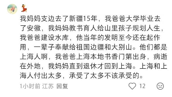 上海现在最大的问题是什么呢? ------------------------------------ 转发: 这位朋友率先提到了一个对比。 上海人曾经住着最小最破的房子,却上缴最多最重的税。 还介绍了一个数据。83.94%。 1949年到1990年,上海当地财政收入总计3911.79亿,上缴达到3283.66亿。 这是汪老当年的总结。 每天早晨,我看到马路上有那么多的煤球炉在生火,到处是烟雾腾腾,那么多马桶在马路上刷洗。 可就是这样一个上海,背负了太多的上海,却在大多数情况下面临这样一个局面。 一位网友还提到当年浦东开发的情况。 还有她妈妈去新疆15年。她爸爸去安徽建设水库若干年。她爸爸地地刮刮上海书香门第出身,却病逝在外地。她妈妈也是直到退休才回到上海。 她的最后一句话格外打动我,上海和上海人付出太多,承受了太多不该承受的。 而下面这位朋友提到的情况比较少见。 因为,在各种道听途说的传闻中,上海阿姨上海老太太一直是刻薄刁钻的形象。 这位朋友提到了上海人的思维方式、生活方式和语言系统。 这位网友提到了义勇军进行曲,以及当年浴血奋战的那些事。 这位朋友提到了上海的宋阿毛。 宋阿毛是当年上海1576名战士之一。 这是宋阿毛的绝笔信。 在以上所有讨论中,我最喜欢的是这位朋友一段话。送给大家。