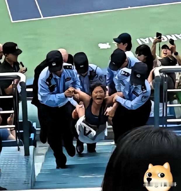 华裔女子网球赛场挑战中国法律,还拿出外国护照对警方进行挑衅,结局大快人心! 2025年上海网球大师赛期间,一名女子因扰乱比赛秩序最终被抬出球场,场面搞笑又令人不齿。 上海闵行警方发布通报,46岁的谢某某在旗忠网球中心酒后观赛时持续大声喧哗,严重扰乱赛场秩序,导致比赛一度暂停。现场民警反复劝阻无效后,最终依法将她带离现场。 这名身着背心的女球迷在意大利球员贝雷蒂尼对阵法国球员马纳里诺的比赛中,多次发出全场都能听到的尖叫声。她不停地站起来在座位上以各种姿态扭动,完全不顾及周围观众的观赛体验。 当安保人员示意她保持安静时,她不仅没有理会,反而掏出一个证件起身对着安保人员挥舞比画。比赛因此受到影响反复中断,裁判多次示意她保持安静,但她丝毫没有改观。 现场目击者回忆,就连她随身携带的小男孩都在努力劝阻她。这个孩子拉扯着她的手臂,试图让这位激动的母亲坐下来保持安静。孩子的眼睛里满是困惑与无助,与母亲的失态形成鲜明对比。 看台上的观众们终于忍无可忍,齐声高喊“Get out”(滚出去)。体育场内回荡着众人的抗议声,这是公共空间里民众自发的秩序维护。 多名安保人员上前将她控制时,她仍在尖叫挣扎。最终,她被抬出看台的那一刻,全场响起了热烈的掌声。那掌声既是对赛事方果断处理的肯定,也是对公共秩序得以恢复的欣慰。 谢某某最终因扰乱赛场秩序被依法予以行政处罚。法律不会因任何人的身份而网开一面,无论是手持哪国护照,在中国领土上就必须遵守中国的法律法规。 这场比赛开始前一周,上海大师赛官方微博就曾发布观赛礼仪,明确强调“在比赛过程中切忌大声喊叫影响球员发挥”。文明观赛不仅是基本礼仪,更是对运动员和其他观众的尊重。 类似事件并非首例。2018年,一名自称外籍华人的女子在北京首都机场因拒绝安检大闹机场。她辱骂民警称“这是言论自由,我在国外都这样”,最终因妨碍公共秩序被行政拘留15日。 这些事件折射出个别人士对公共秩序的漠视,以及试图用身份逃避法律责任的侥幸心理。任何一个文明社会都不会纵容这种行径。 各位读者你们怎么看?欢迎在评论区讨论。