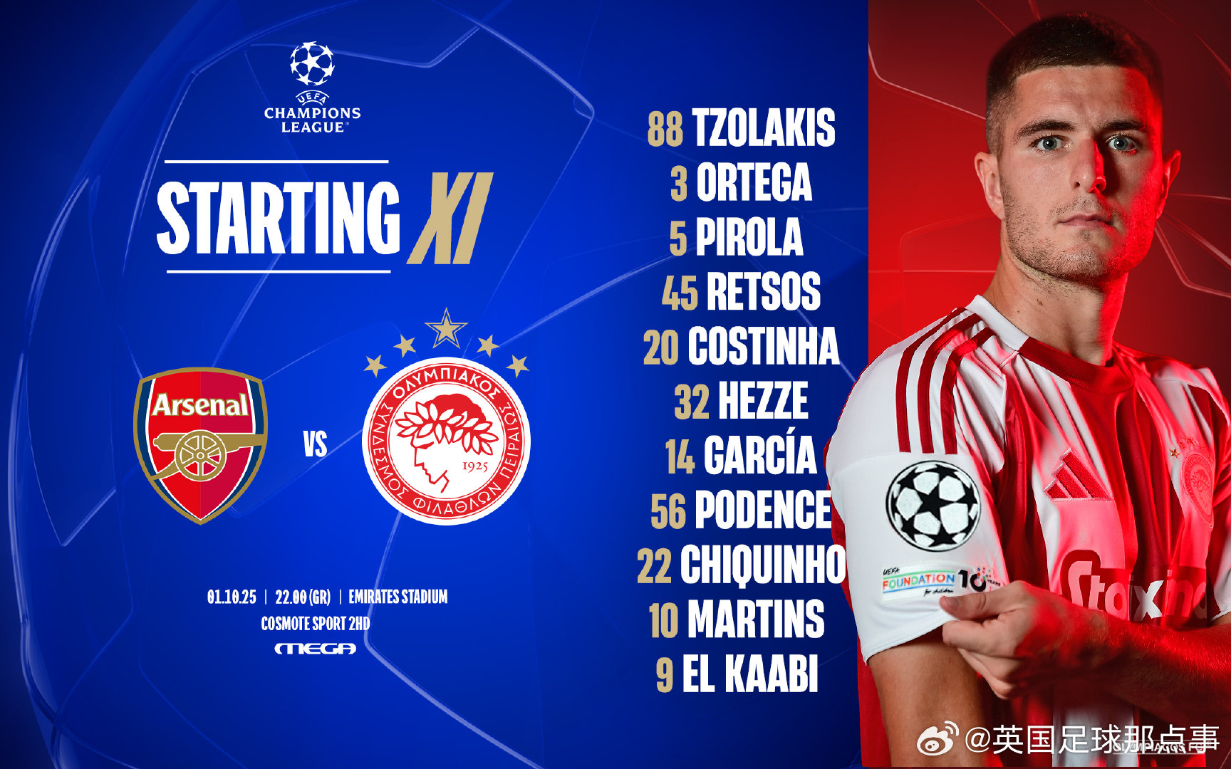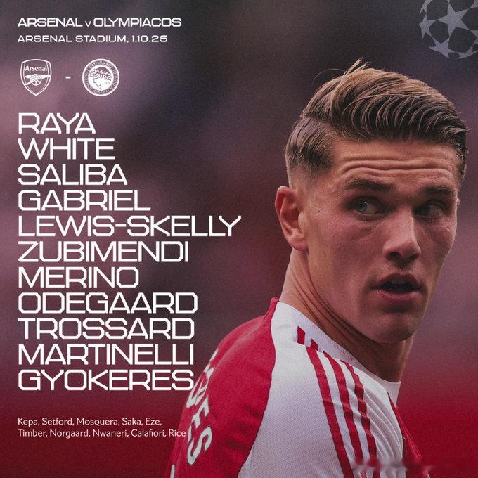 阿森纳vs奥林匹亚科斯 首发阵容⬇️