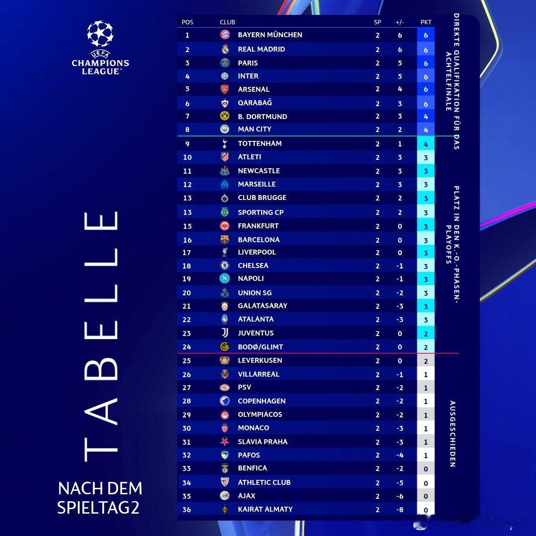 欧冠联赛阶段第二轮结束,即使积分榜如图⚽