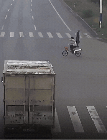 男子骑个自行车横穿马路。全程左手换右手,示意来往车辆要让着他,结果没有刹住车,遭到大车碾压! 网友:就这豪横劲,小命早就在阎王那登记在册了……