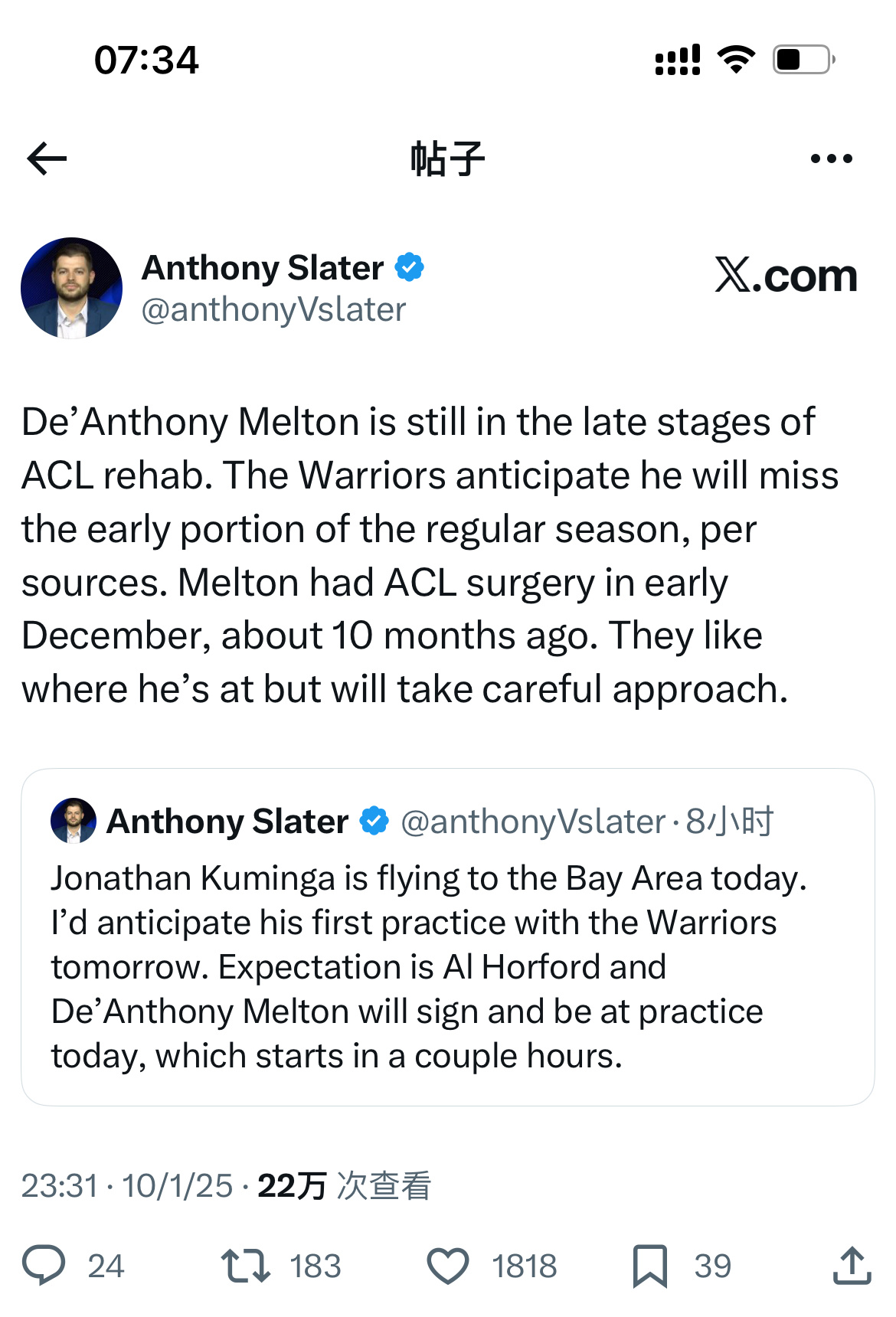 AS:德安东尼·梅尔顿(De’Anthony Melton)的ACL(前交叉韧带)康复已进入后期。勇士队预计他将错过常规赛的初期比赛。梅尔顿在去年12月初接受了ACL手术,至今已有约10个月。勇士队对他目前的恢复状况感到满意,但会采取谨慎的态度。