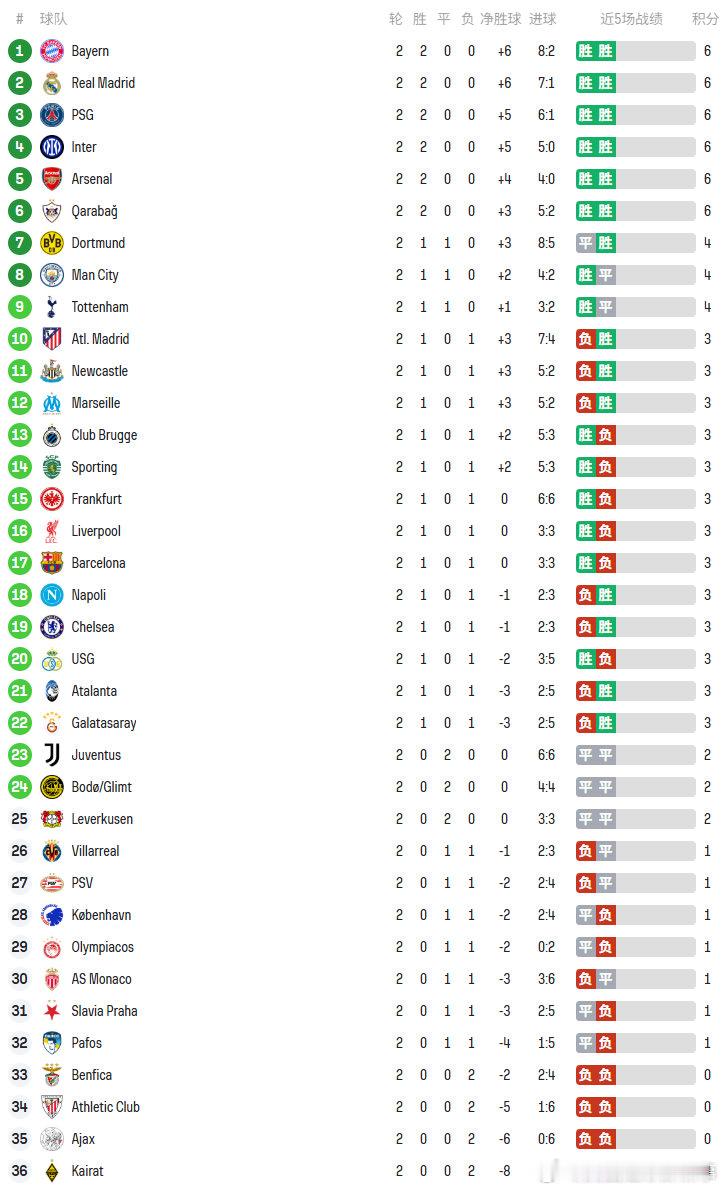 欧冠联赛2轮后积分榜📊