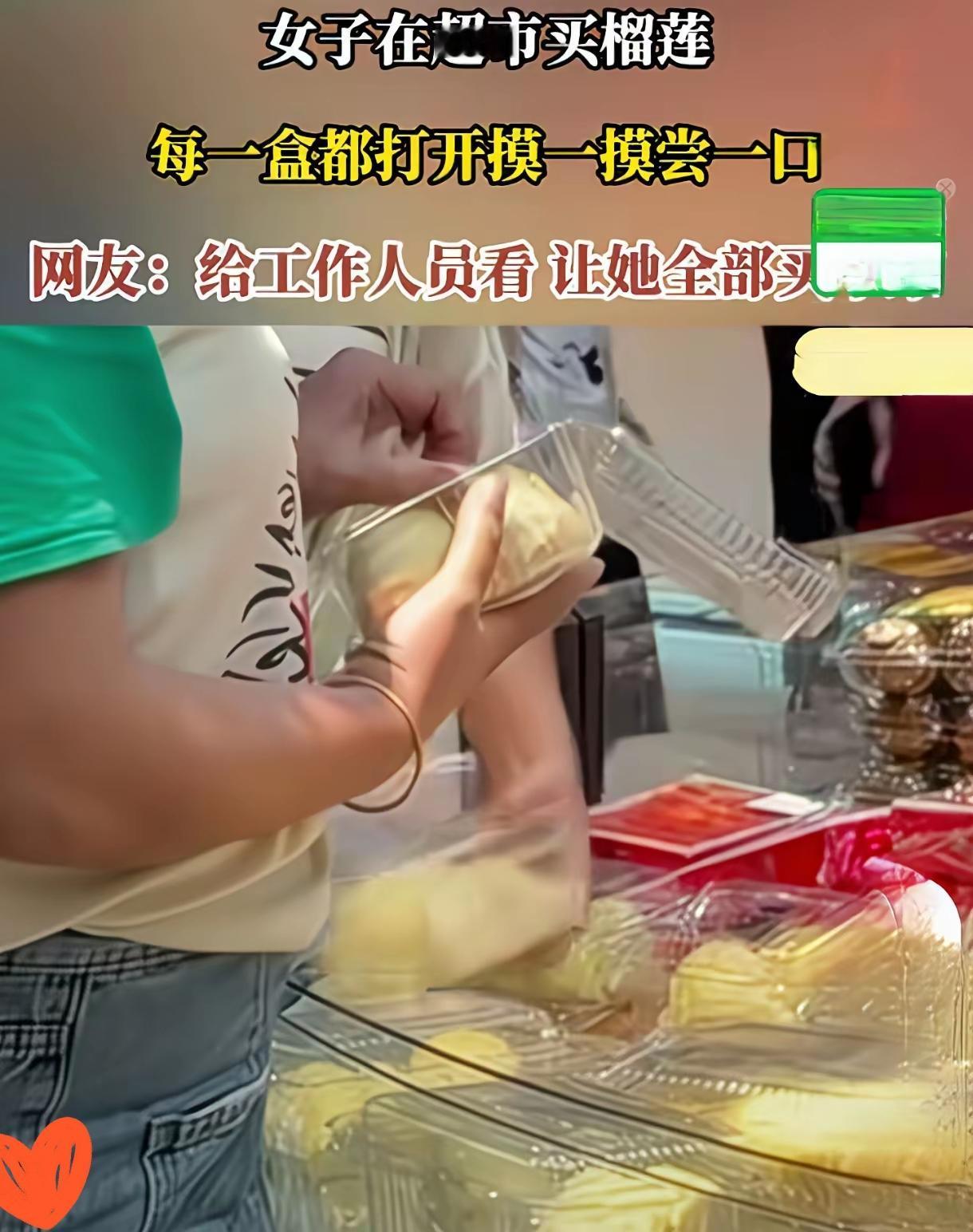 俩女子在超市买榴莲,每一盒都打开摸一下,尝一下,让她把所有榴莲都买下,真恶心人 刷到个超市榴莲视频,给我膈应得半天没缓过来!俩女子对着冷藏柜里剥好的盒装榴莲,竟然一盒接一盒打开,上手摸完果肉,还直接掰一小块尝,尝完不满意就随手丢回货架,全程没一点不好意思,那理所当然的样子,看得人火大! 这哪是买水果,分明是把超市当自家试吃摊了!且不说手上的细菌全沾在果肉上,后面的人买走吃坏肚子算谁的?超市要是早把这些盒装水果密封好,再贴上“开封即购买”的提示,哪还有这种人钻空子的机会。 真该让她俩把动过的榴莲全买下,不然这风气一旦传开,以后谁还敢买超市的盒装水果?大家碰到这种没素质的行为,是会直接上前制止,还是找超市工作人员处理呢?