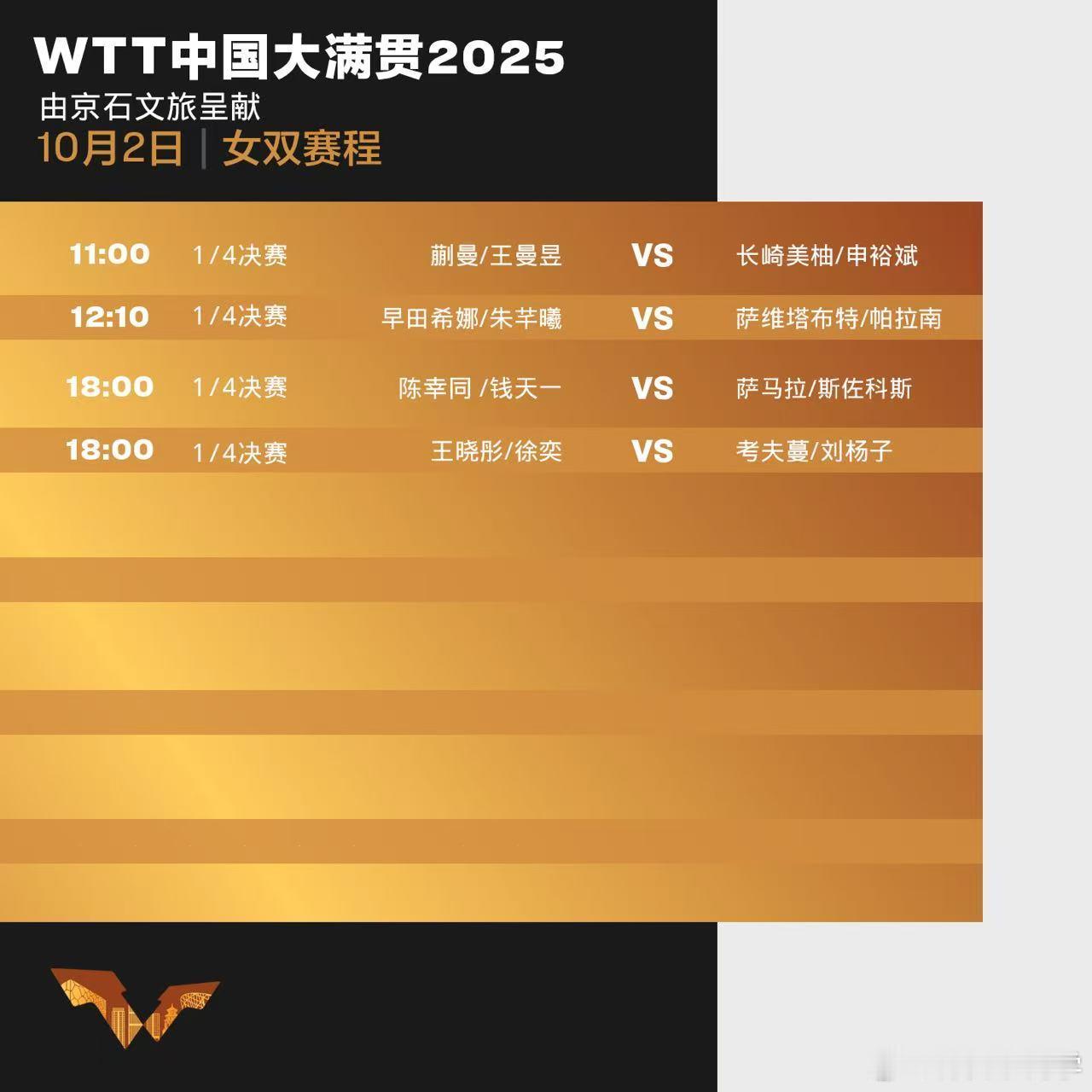 wtt中国大满贯2025 10.2赛程