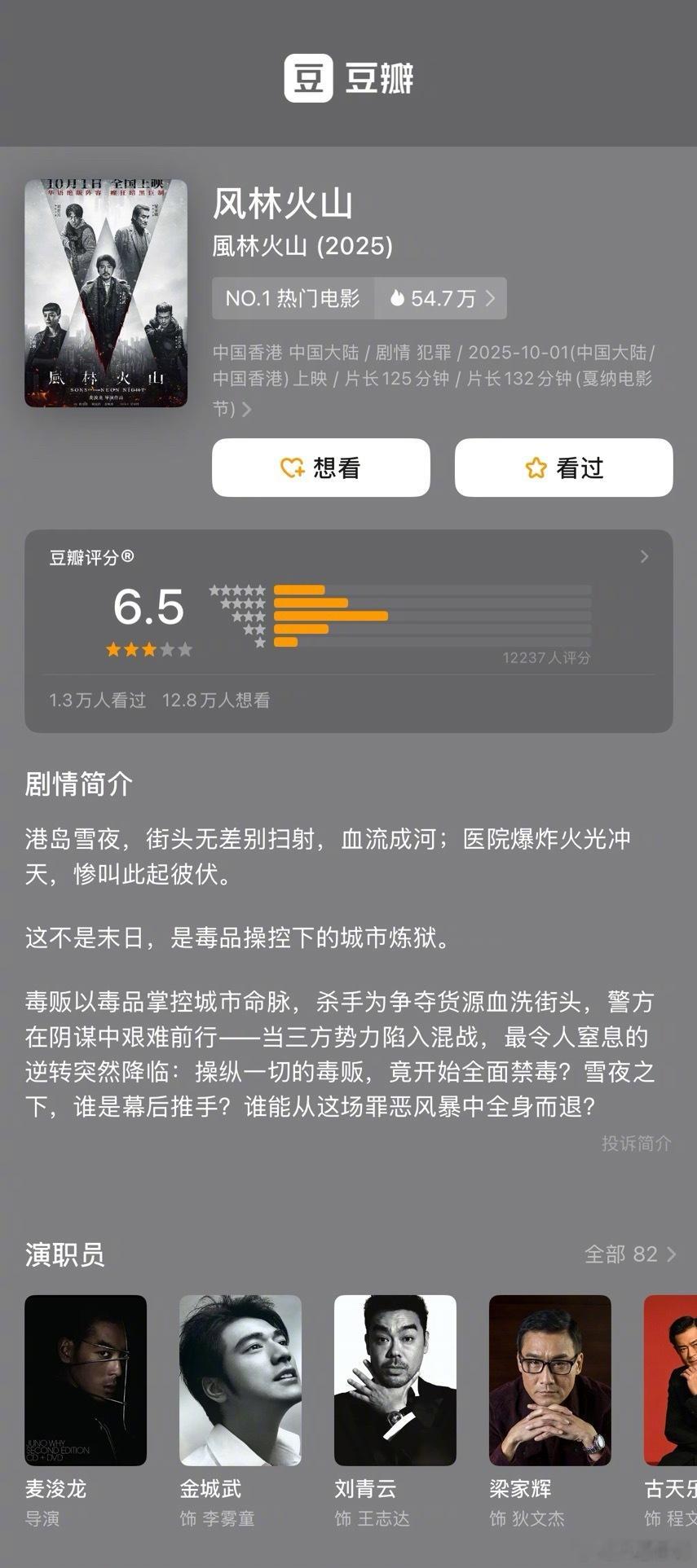 《风林火山》开分6.5分。领衔主演:金城武、刘青云、梁家辉、古天乐、高圆圆