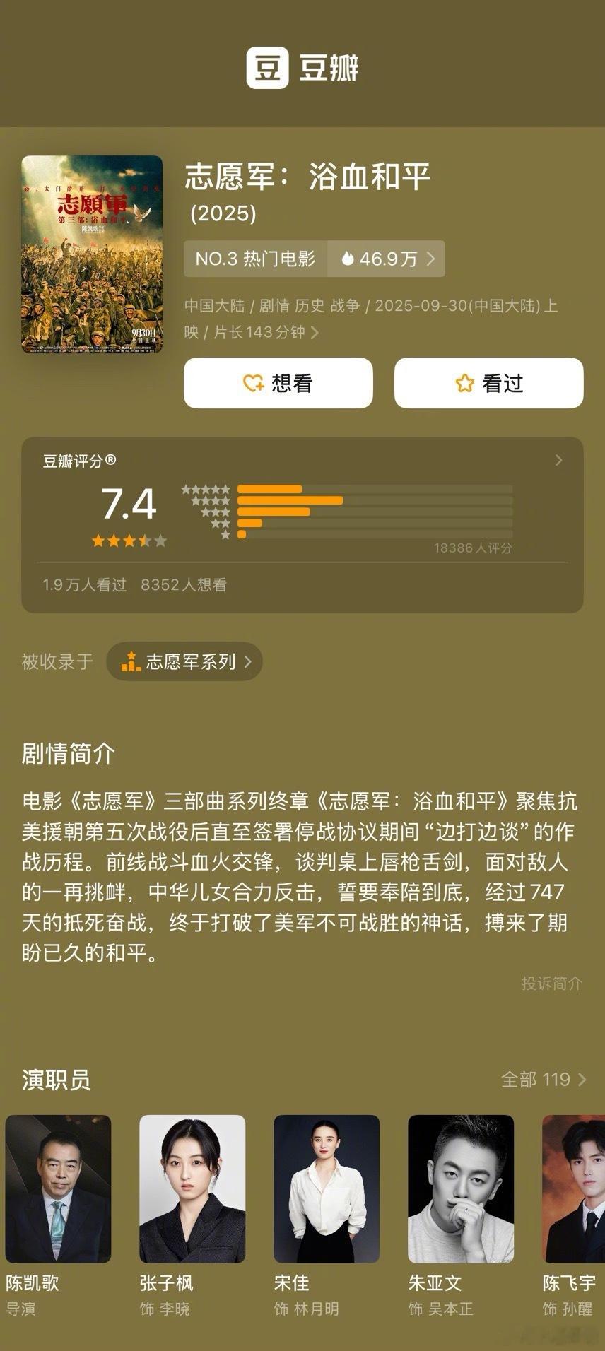 《志愿军:浴血和平》开分7.4分。领衔主演:张子枫、宋佳、朱亚文、陈飞宇等