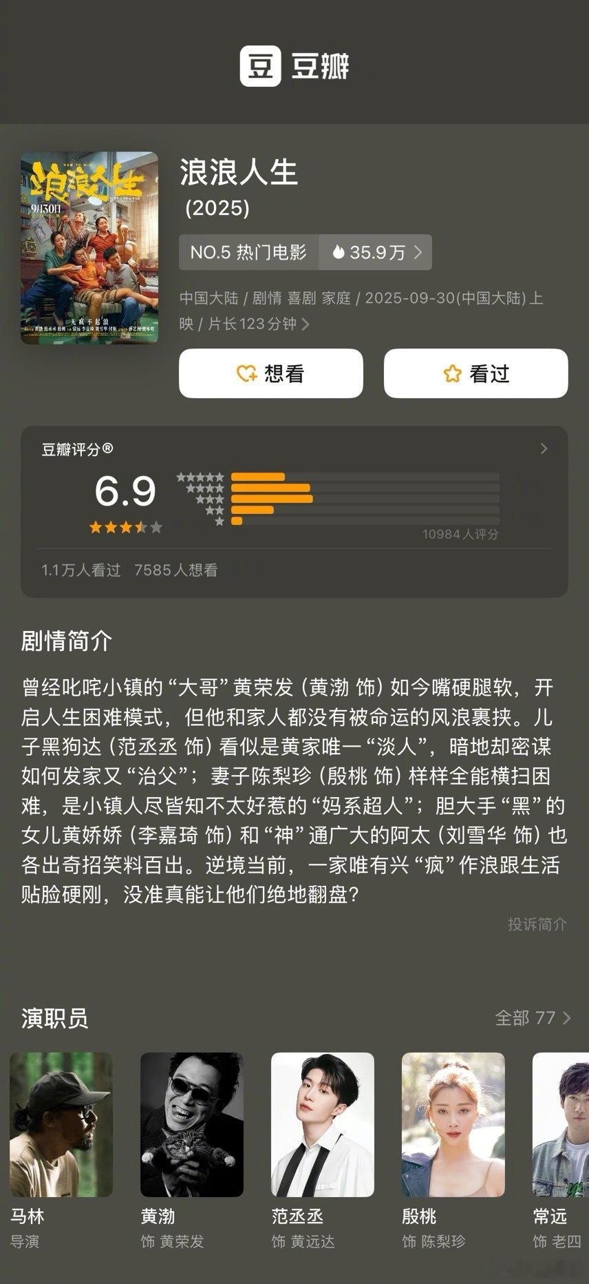 《浪浪人生》开分6.9分。领衔主演:黄渤、范丞丞、殷桃