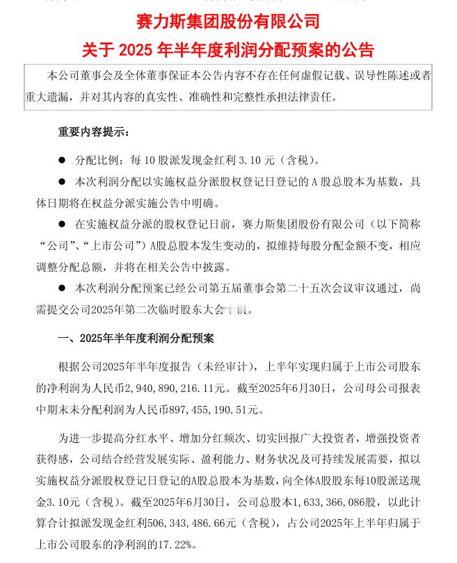 赛力斯 2025 半年度利润分配预案:拟 10 派 3.1 元,合计 5.06 亿元。