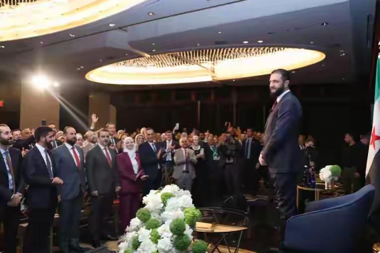 看看朱拉尼在美国接见叙利亚侨民,包头巾如鸭蛋女人站在第1排。 另外朱拉尼还带了几