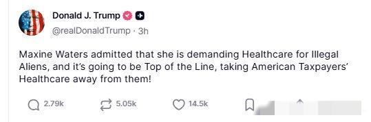 现在美国民主党和共和党的分歧就在于: 民主党主张:医疗保障(Medicaid、Obamacare 补贴等)应该覆盖到部分合法居留的非美国公民,包括合法获批的难民、庇护者等。民主党认为,这些人已经在美国合法生活、工作、纳税,应当有基本医保保障。 共和党主张医疗补贴必须严格限于美国公民。对非公民(non-citizens),无论合法还是非法,都要切断大部分补贴,只保留部分紧急医疗援助。 共和党会把民主党的主张表述为:“民主党希望给「非法移民」提供医疗保险补贴”。但是实际上,根据美国法律非法移民始终都是无法获取到医疗保险补贴的。 特朗普谴责众议院马克辛力主为非法移民提供医保。 “马克辛·沃特斯承认,她要求为非法移民提供医疗保健,而且这将是最高级的,剥夺美国纳税人的医保”