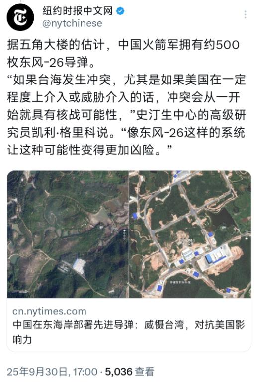 五角大楼又开始双标了?9月30日纽约时报表示,五角大楼盯着中国火箭军那500枚东风-26导弹,还拉来史汀生中心的研究员造势,说这会让台海冲突的核战可能性变得更凶险。 可这话要是跟五角大楼自己干的事儿放一块儿比,就显得特滑稽。 前脚刚把东风-26渲染成“风险制造者”,后脚美国自己倒在亚太忙着摆导弹阵。当年是美国主动撕毁《中导条约》,2019年刚退约没几天就急着试射以前被禁止的陆基导弹,摆明了就是要在中程导弹领域搞事情。 后来搞出的“堤丰”系统,听着名头挺唬人,实际上就是把海军舰艇上的MK41发射器拆下来焊上轮子,里头塞的还是标准-6和战斧这些上世纪的老导弹,纯粹是旧瓶装新酒。 可就这玩意儿,美军去年4月直接拉到菲律宾吕宋岛架起来搞军演,号称是冷战后首次在亚太部署陆基中程导弹,威慑力拉满,中国外交部说这会加剧军备竞赛,五角大楼压根不当回事。 更有意思的是美国那“暗鹰”高超音速导弹,从实验室拉到靶场就一路故障不断,2023年两场试射全黄了,2024年又接连叫停,到现在原型弹投产时间一推再推,却还嘴硬说要部署到亚太“平衡力量”。 这架势跟指责东风-26“增加风险”的论调摆在一起,简直是自相矛盾——合着美国折腾半天搞中程导弹、高超音速武器是“维护安全”,中国搞东风-26就是“制造凶险”? 还有核威慑这事儿,五角大楼更没资格说别人。今年年初美日刚敲定了“延伸威慑”相关指针,说白了就是把美国的核保护伞往亚太挪,打算让战略轰炸机、弹道导弹核潜艇堂而皇之地进驻日本。 军事观察员都警告了,这是把核对抗引到亚太,会带来灾难性影响,可五角大楼对这事儿的风险提都不提。反倒盯着东风-26的核常兼备能力大做文章,忘了自己才是把核火药桶往热点地区搬的那个。 要知道东风-26是公路机动发射,停在自家公路上就能作战,10分钟内就能完成停车、发射、转移,本质上就是家门口的防御力量。 而美国是把“堤丰”系统直接架到吕宋岛这种靠近中国的地方,还一门心思要把“暗鹰”部署到关岛、日本,分明是主动把武器顶到别人家门口。 这种“自家部署是威慑,别人防御是威胁”的逻辑,实在说不通。 说白了,五角大楼就是揣着明白装糊涂。自己退群毁约、在亚太到处架导弹、拉着盟友搞核威慑,转头倒嫌中国的防御性武器“凶险”。 合着只许美国把炮架到别人家墙根,不许别人在家门口装个防盗锁?这双标玩得也太顺溜了,说到底还是霸权思维在作祟——只许自己攥着军事优势,见不得别人有半点自保的能力。