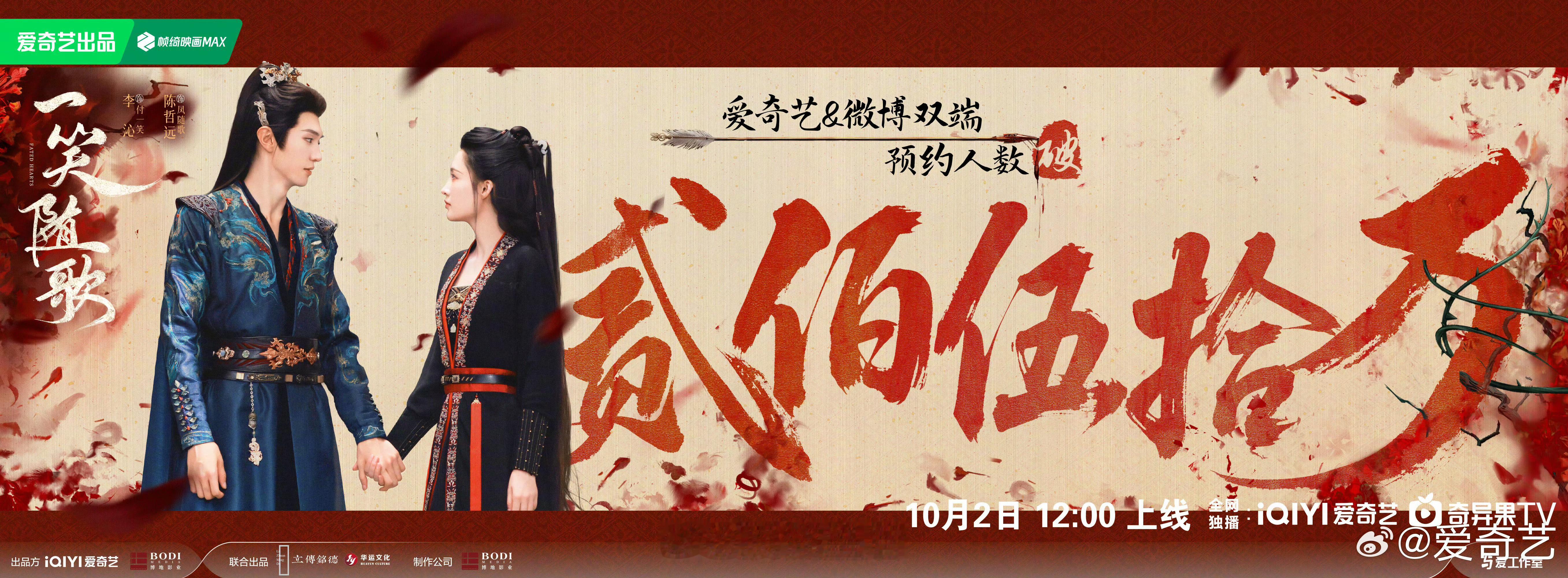 一笑随歌中午十二点在爱奇艺开播,预约人数已破250万,李沁、陈哲远粉丝准备了非常多云包场,目前唯一一部在国庆档放假期间播出的古装剧,都来看呀。