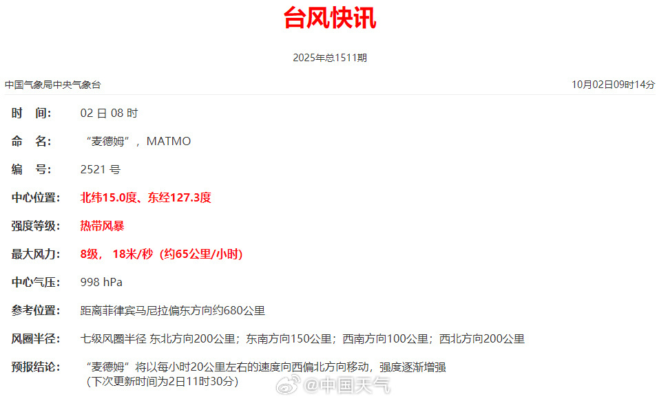 【#台风麦德姆已生成#】#第21号台风麦德姆已生成# 今年第21号台风“麦德姆”已经生成(英文名称:Matmo;名字来源:美国;意义:大雨),今8时,其中心位于菲律宾马尼拉偏东方约680公里的洋面上,强度为热带风暴级(8级,18米/秒)。