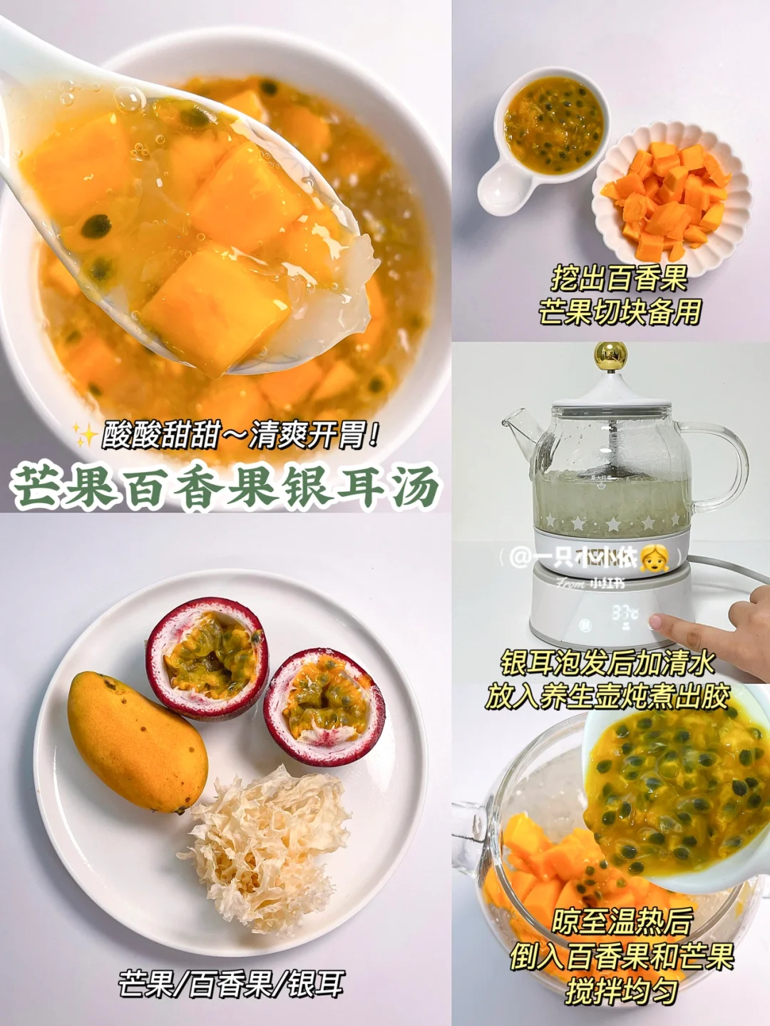 🔹做法:挖出百香果,芒果切块备用;银耳去蒂提前泡发,放入养生壶加适量清水,炖煮至出胶后晾至温热;倒入百香果和芒果搅拌均匀