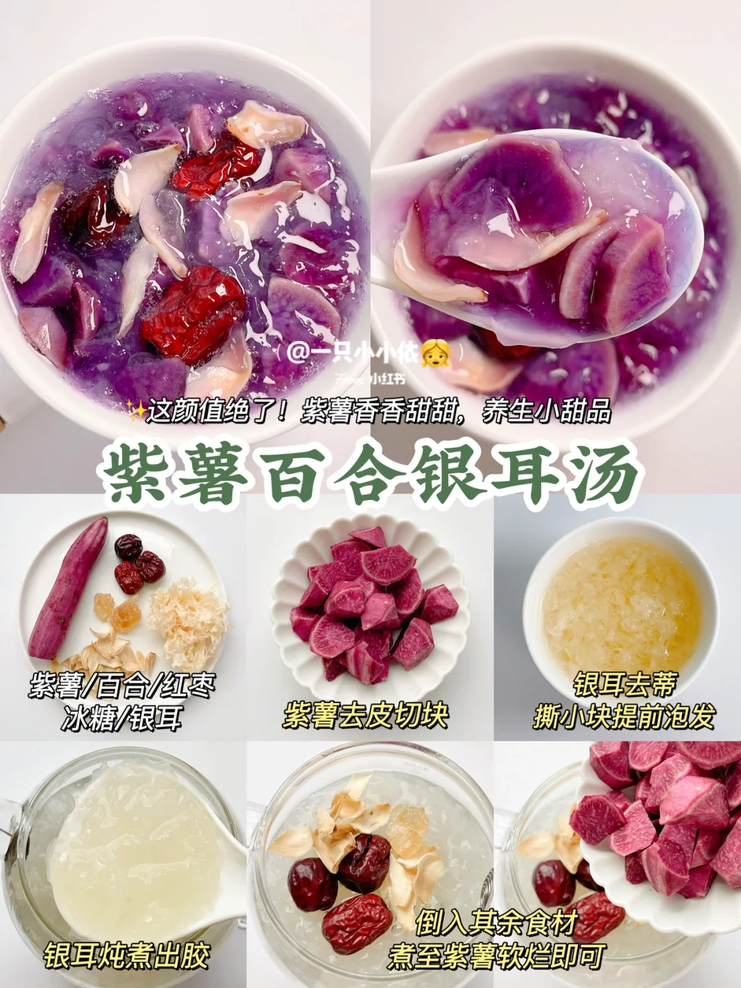 🔹做法:紫薯去皮切块,银耳去蒂提前泡发,炖煮至出胶;倒入其余食材,煮至紫薯软烂即可
