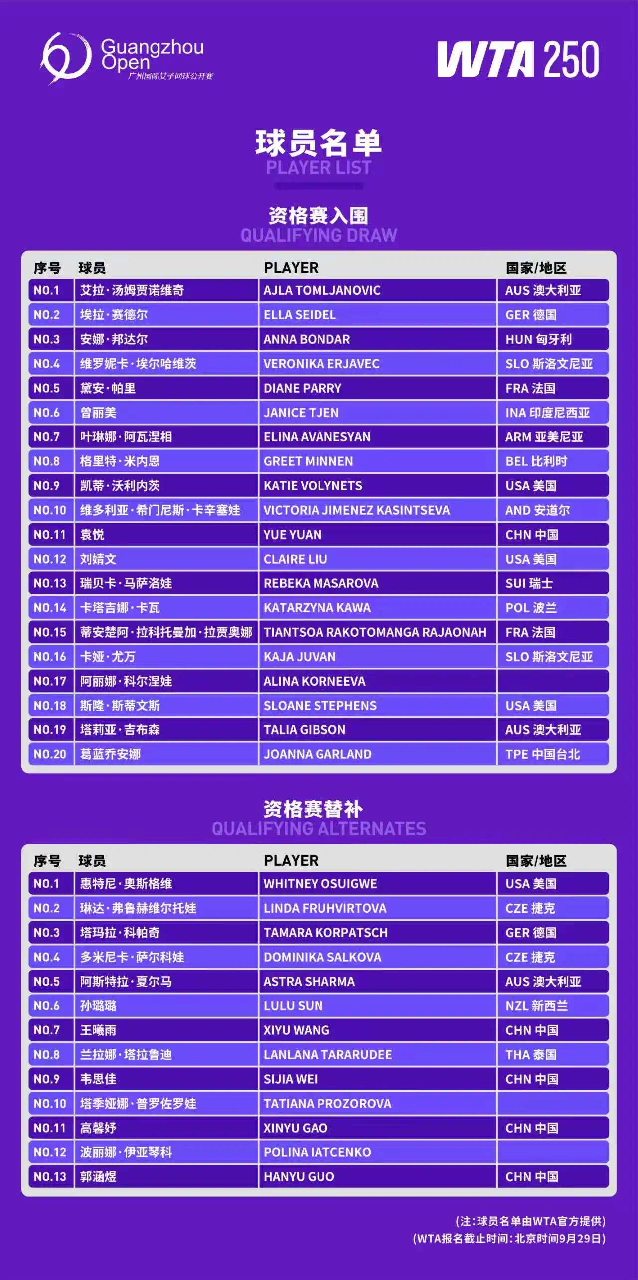 前美网冠军斯蒂文斯、三届大满贯八强汤姆贾诺维奇、WTA巡回赛冠军得主袁悦、印尼新星曾丽美在列,此外,孙璐璐、韦思佳、高馨妤、郭涵煜则在替补名单中。目前外卡还没有宣布,可以期待🤩~