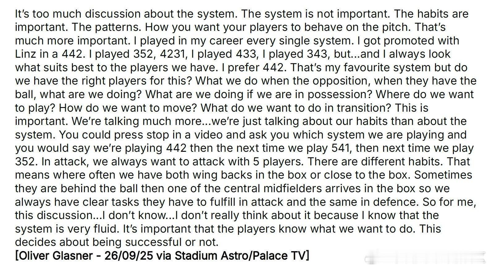格拉斯纳:现在探讨球队体系阵型的人太多了,什么阵型其实并不重要,重要的是习惯是模式。你想让你的球员在场上如何踢球,这才是重要的。我的教练生涯中用过所有的阵型,我带着林茨升级用过442,我踢过352,4231,我还踢过433,343,但我始终关注的是什么阵型更适合我现有的球员。我更喜欢442,这是我最喜欢的阵型但是我们有合适的球员踢这个阵型嘛?当对手控球的时候我们要怎么做?当我们自己控球时我们要怎么做?我们想把球传到哪里?球员想要怎么跑动?我们想在攻防转换的时候怎么做?这些才是最重要的,我们更多谈论的是我们的踢球习惯而不是阵型。你可以在看比赛视频的时候点个暂停然后问我们踢的什么阵型,然后说我们在踢442然后你下次再点我们又是541,然后再下次我们是352。进攻的时候我们一直希望进攻端有五名球员参与,这有不同的习惯。这意味着在进攻的时候我们的两个边后卫会进入禁区或者是靠近禁区,有些时候他们会等其中一名中场球员进入禁区之后保持在球的后方位置,所以我们一直会有明确的任务需要他们在进攻端或者是防守端完成。所以对我来说,关于(阵型的)讨论,我其实不知道,因为球队的阵型是很灵活多变的,更重要的是球员们要知道我们要做什么,这才是决定我们能否成功的关键。