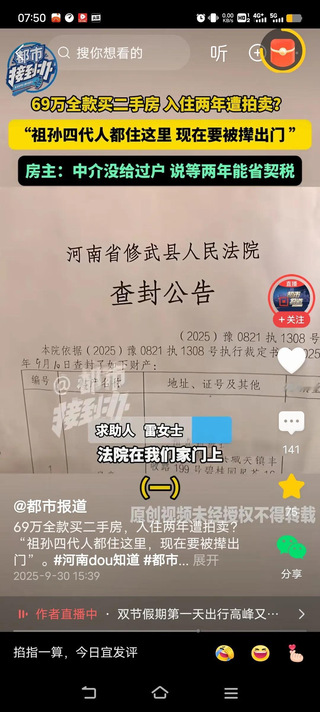河南焦作,女子花69万跟中介公司全款买套二手房,中介告诉女子,“晚2年过户可以省下几万元契税”女子信以为真,没想到,2年不到,女子得知中介并未结清房款给原房主,导致原房主断供,房子被拍卖,女子再找中介,已经人去楼空,女子无奈找媒体诉苦:我们祖孙四代都住这,现在就要被赶出去了。 2023年,雷女士和爱人在焦武某家中介公司买了一套二手房。 当时房款是一次性付清,一共花了69万,其中有30万是通过银行转账给该公司老板,还有39万付的现金。 因为这家公司规模不算小,看着也挺正规,所以,公司老板说什么,雷女士和爱人都信以为真。 中介告诉雷女士,原房主已经把房子卖给他们,一切手续只要跟他们办就行了,不用担心。 买下房子后不久,雷女士提出要过户房子,可中介却告诉雷女士,如果能晚2年再过户,可以替他们省下几万块钱契税。 当时雷女士和丈夫考虑到刚全款买房,手里没剩多少钱,就想着能省点就省点,而且中介公司肯定地说,他们做事靠谱。 所以,雷女士夫妇采纳了中介公司的意见,等两年后再过户也不迟。 因为房子是二手房,装修各方面都还不错,所以雷女士一家只是简单修整一下,就一家老小开开心心住进去了。 就在他们等待着,2年过后,房子过户了,他们就是房子真正主人的时候,意外却发生了。 今年三月份,银行工作人员突然来敲开雷女士的家门,告知雷女士:这套房子已经断供了,原因是中介没有把房款结清给原房主。 房子还是在原房主的名下,根本没有过户到中介,因为房子断供,银行要起诉原房主,把这套房子拍卖了。 雷女士一听犹如晴天霹雳,可他们明明是两年前就已经把全款都交给中介了呀? 雷女士着急万分,多次找中介协商,他们却一拖再拖,最后直接联系不上了。 几天前,法院到雷女士家门口贴了查封公告,银行工作人员也上门告知雷女士,过完节,这套房子就要拍卖了,让他们尽快腾空房子。 雷女士真是叫天不应叫地不灵,中介公司已经人去楼空,老板电话也联系不上了,自己一家老小即将被赶出家门,他们上哪说理去? 无奈的雷女士找到媒体协助。 记者跟着雷女士来到该公司,发现公司关着门,公司门口还贴了各种违章通知,记者试图联系该公司老板,但是电话打不通。 记者又联系了之前在该公司做事的员工,员工告诉他们,自己也找不到老板,而且老板还欠了她几个月工资一直没发。 记者针对雷女士这个事件帮忙联系了律师,律师告诉他们,雷女士这个事情,不单单是简单的民事纠纷,如果公安部查清这个老板确实存在合同诈骗,得追究他的刑事责任。 目前雷女士已经报警,案件还在进一步调查中。 那么,从法律角度如何分析这个案例呢?  《民法典》第209条规定,不动产物权的设立、变更、转让和消灭,经依法登记,发生效力;未经登记,不发生效力,但是法律另有规定的除外。 本案中,雷女士虽全款支付69万元并入住房屋两年,但因中介以“省契税”为由未办理过户登记,房屋物权仍属于原房主 。 这导致原房主因中介未结清房款而断供时,银行可依法对登记在其名下的房屋申请拍卖,雷女士无法以“实际居住”对抗法院执行,凸显了不动产登记对产权保障的核心作用。 《民法典》第577条(原《合同法》第107条)规定,当事人一方不履行合同义务或者履行合同义务不符合约定的,应当承担继续履行、采取补救措施或者赔偿损失等违约责任。 中介公司作为居间方及房款代收方,既未按约定及时办理过户,也未将全款交付原房主,且事后失联,明显违反合同义务 。 雷女士可依据此条主张中介赔偿全部购房款69万元及房屋装修、居住损失等,同时中介未审查交易风险、虚构“省契税”安全承诺,还违反了忠实居间义务,需加重承担过错责任。 《刑法》第224条规定,有下列情形之一,以非法占有为目的,在签订、履行合同过程中,骗取对方当事人财物,数额较大的,处3年以下有期徒刑或者拘役,并处或者单处罚金。 数额巨大或者有其他严重情节的,处3年以上十年以下有期徒刑,并处罚金等,(四)收受对方当事人给付的货物、货款、预付款或者担保财产后逃匿的。 本案中,中介收取雷女士30万转账及39万现金后,未结清房款给原房主,且公司人去楼空、老板失联,符合“收受货款后逃匿”的情形 。 若公安调查确认其具有非法占有房款的故意,69万元已达“数额巨大”标准,中介老板将被追究合同诈骗罪的刑事责任,雷女士可通过刑事追赃程序追回损失。 此外,雷女士虽面临房屋拍卖,但可依据执行异议条件,提交购房合同、付款凭证、入住证明等,证明未过户非自身原因,尝试通过执行异议之诉维护居住权益。 这个案例提醒大家:买房时别轻易相信“晚过户省税”,存在风险,一定要及时过户,走资金监管,选正规中介,合同条款要写清,全程留痕。发现问题立刻报警并起诉,最大程度保护自己的权益。 关注@猫眼学法 品读案例故事,学习法律经验
