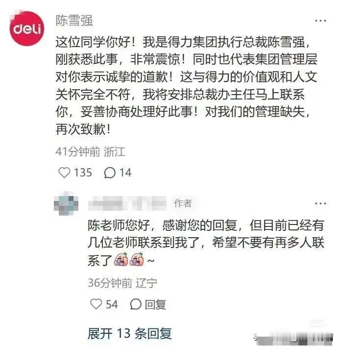 得力集团入职当天劝退裹脚女子后续来了,执行总裁跟帖道歉, 并且派遣办公室主任飞去