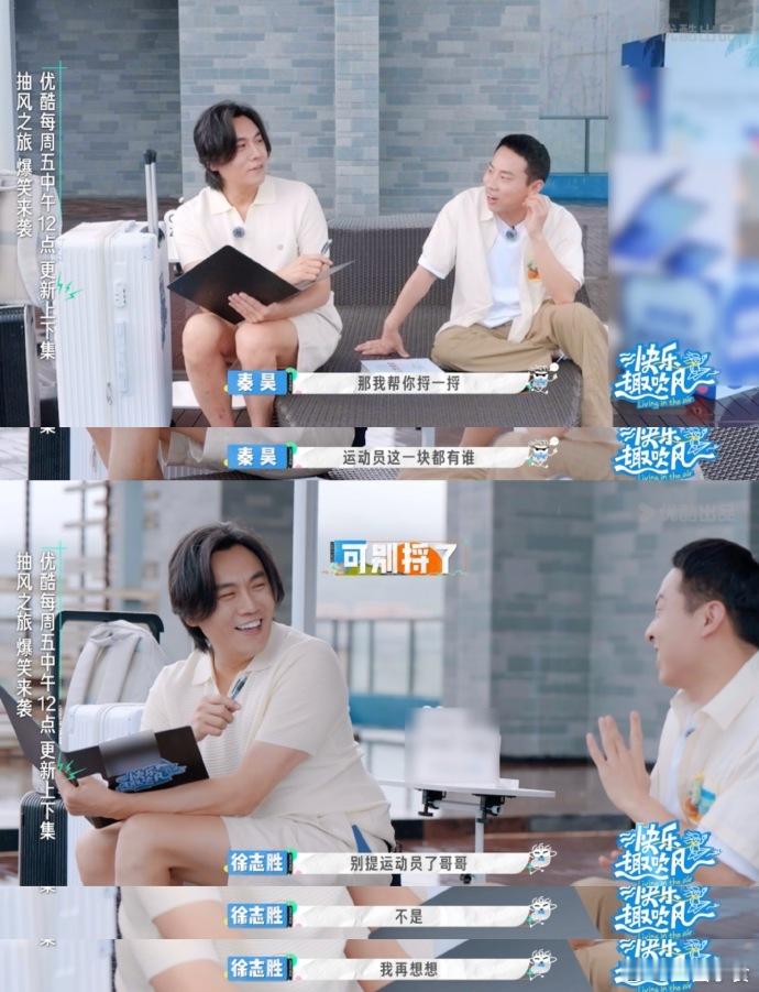 徐志胜最怕合作秦昊快乐趣吹风徐志胜在《快乐趣吹风》碰上秦昊这“劲敌”啦!秦昊见面就抛“送命题”,志胜反手“最不想合作你”,这下惨咯,行李分配要“遭殃”!