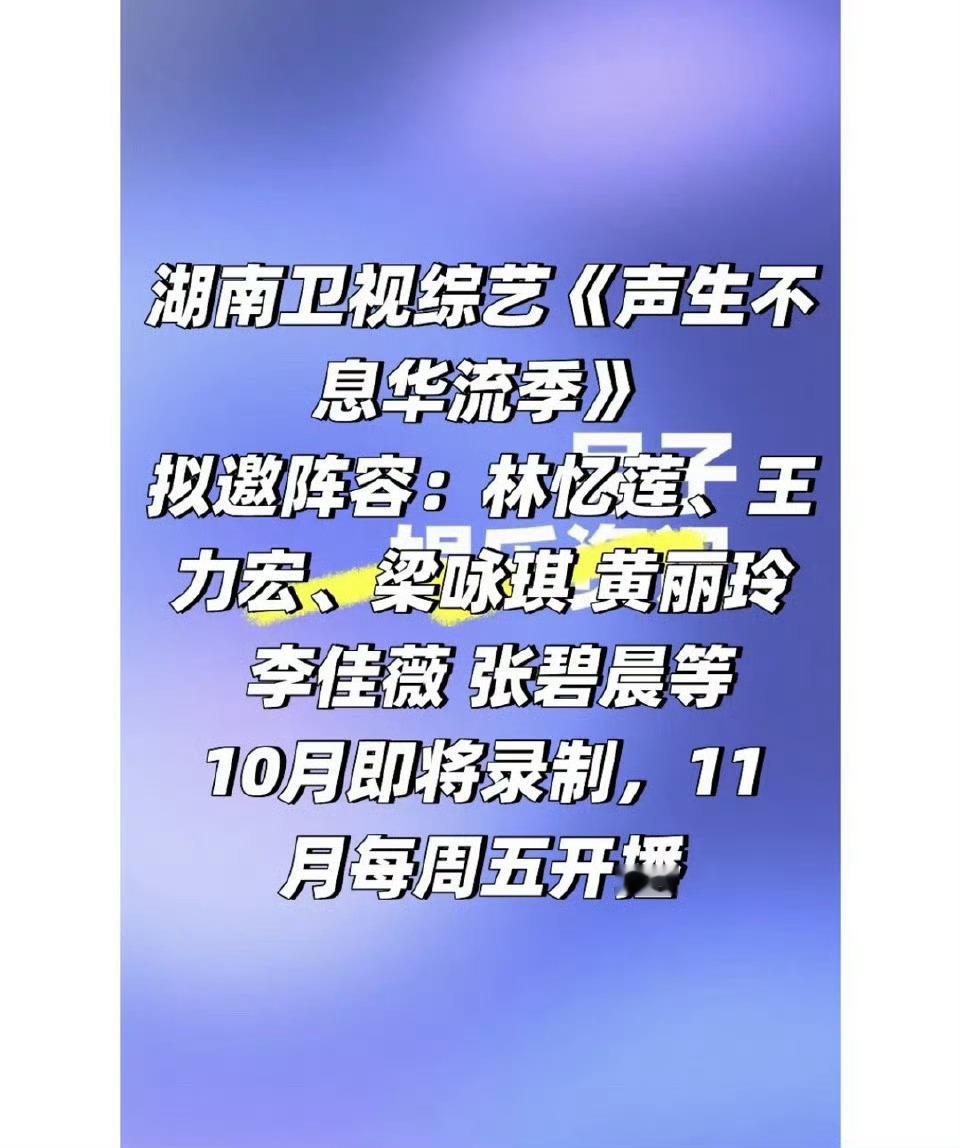 网传声生不息华流季阵容网传《声生不息华流季》嘉宾阵容:林忆莲、王力宏、alin、李佳薇、张碧晨、梁咏琪等,你期待吗?👀 ​​​