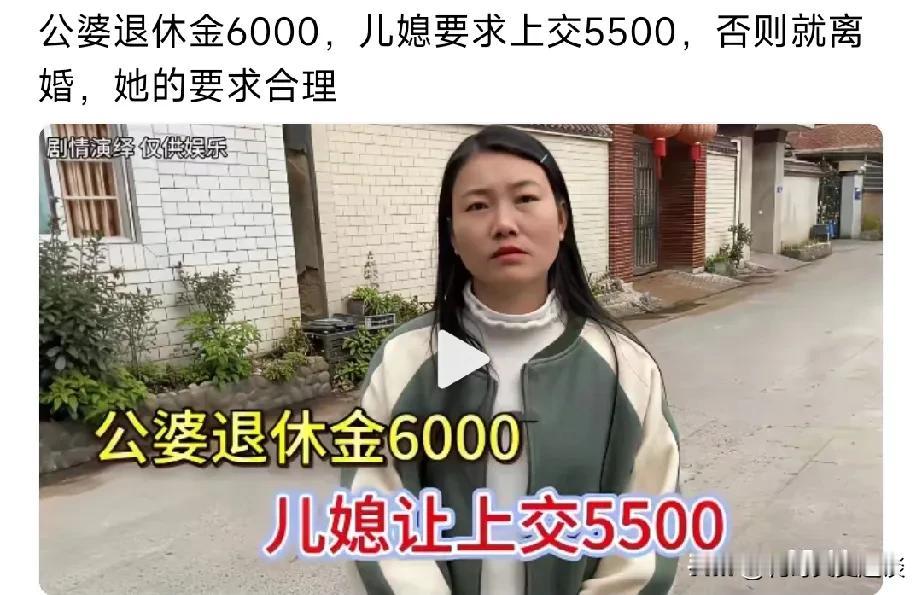 女子要求太霸道。逼的公婆没法过日子。女子从结婚进门就要求公婆把退休金6000上交5500,说不交给她就离婚。 女子老公兄妹俩,有个妹妹,都结婚了。公婆是退休工人,俩人退休金🈶6000块钱。生活条件还行。但是,从结婚后,和公婆一起生活,他说公婆跟着他们一起生活,没必要再拿钱了,应该交给她保管,男子怕老婆不敢反驳,开始公婆不愿意,因为还有一个女儿,都给她咋办。 女子说如果不按她说的办,就和他儿子离婚。逼的老头老太太很无奈,只好答应。把每个月工资都得给儿媳妇,老两口只留500块钱。 这儿媳妇太强势了,男人是个妻管严。