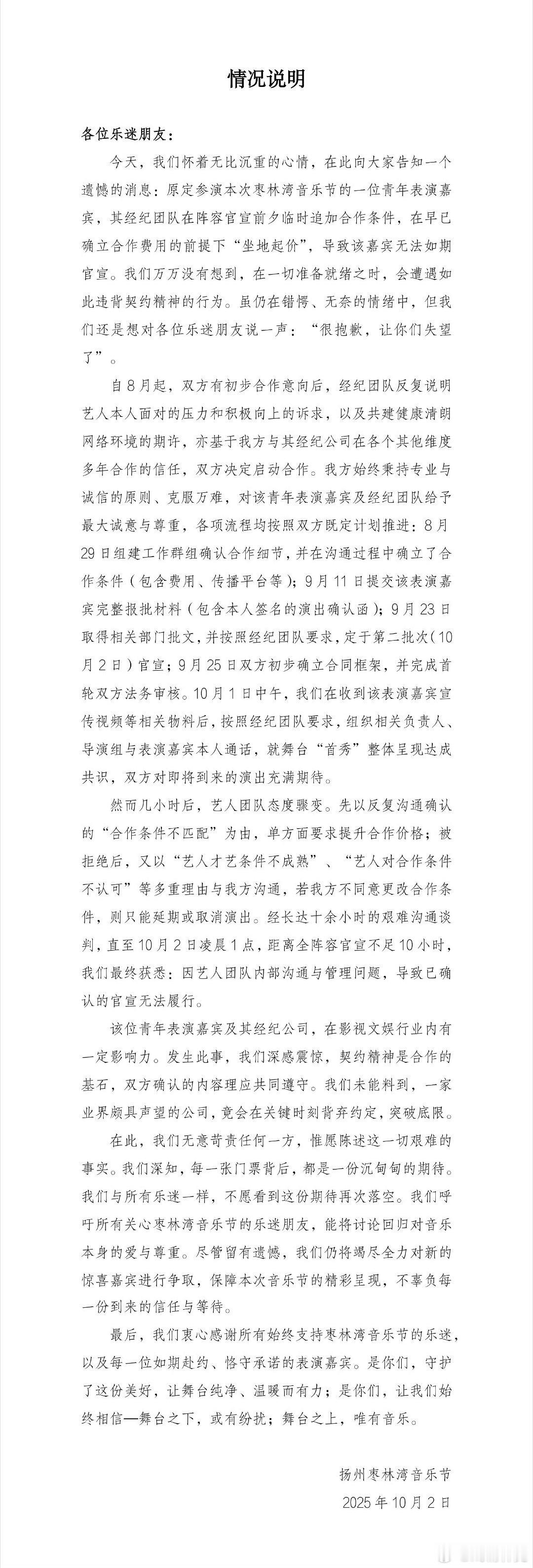 枣林湾音乐节的主办方开麦怒怼:某位青年表演嘉宾团队临时坐地起价,导致最终没有顺利