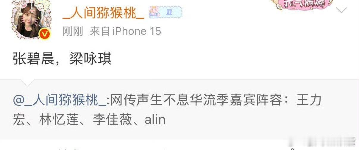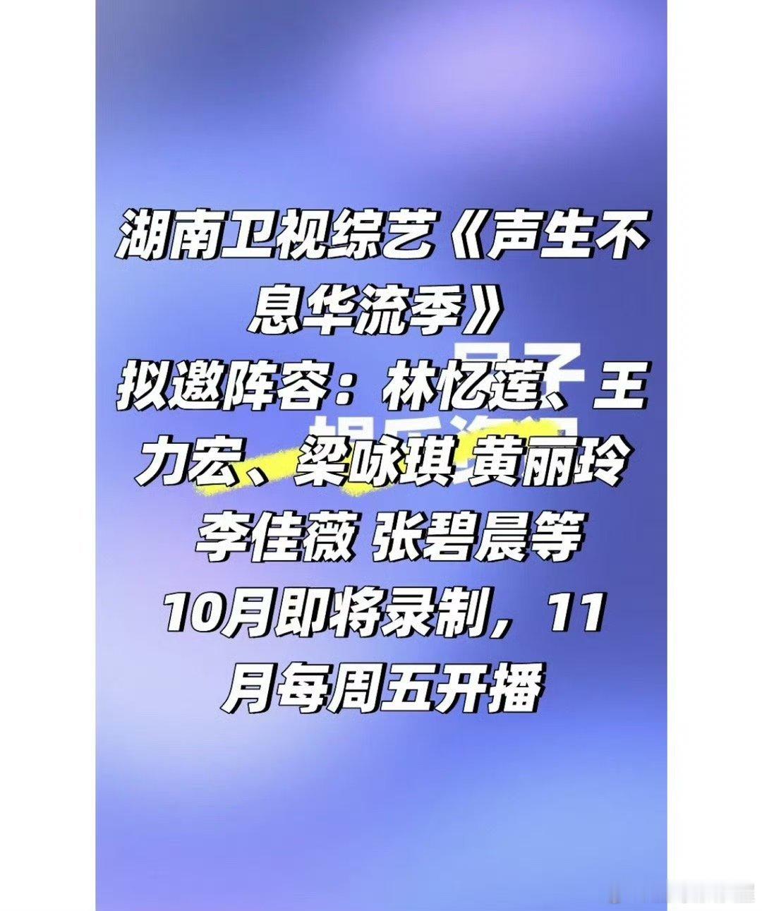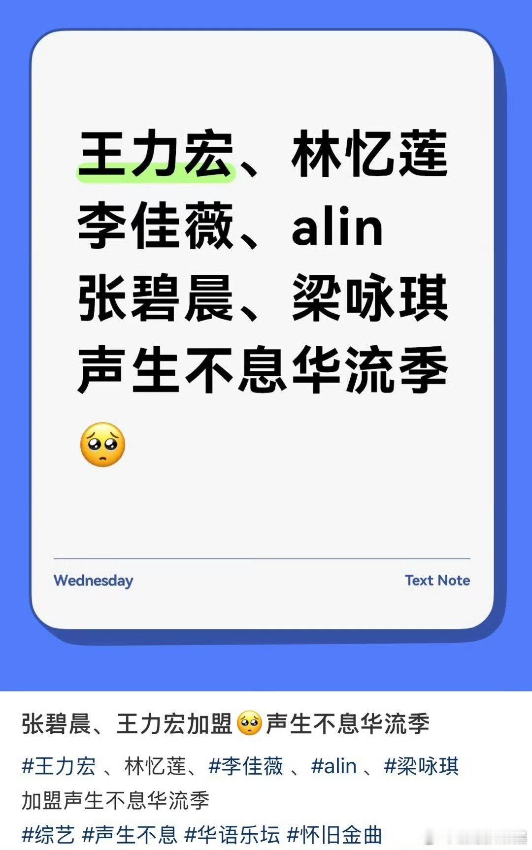 网传《声生不息华流季》嘉宾阵容:林忆莲、王力宏、alin、李佳薇、张碧晨、梁咏琪