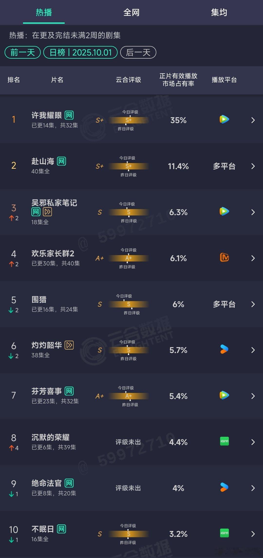 10.01云合:许我耀眼35%赴山海11.4%沉默的荣耀4.4%