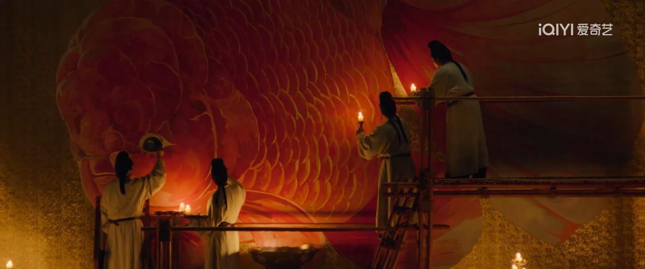 电影《长安的荔枝》,贵妃华诞,权宦鱼朝恩让画师日夜赶工,在墙上画的巨大的红鲤鱼,
