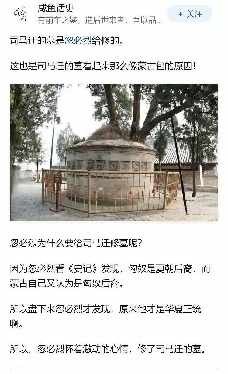 忽必烈说自己是“华夏的正统”,因为他从《史记》中发现,自己是夏朝皇室的后人。为此他还重修了司马迁的墓。[允悲]