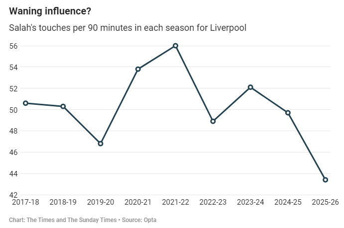 萨拉赫状态下滑,加之今夏球队阵容大幅调整,意味着这位主帅如今需带领球队度过过渡期——这比预期晚了12个月。