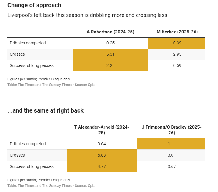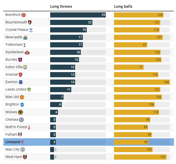 目前,英超联赛中仅有两支球队(曼城和西汉姆联)的禁区内边线球尝试次数比利物浦少(利物浦仅3次),且至今没有一次边线球能准确传给队友。此外,利物浦的长传次数(90次)在英超所有球队中排名倒数第四。