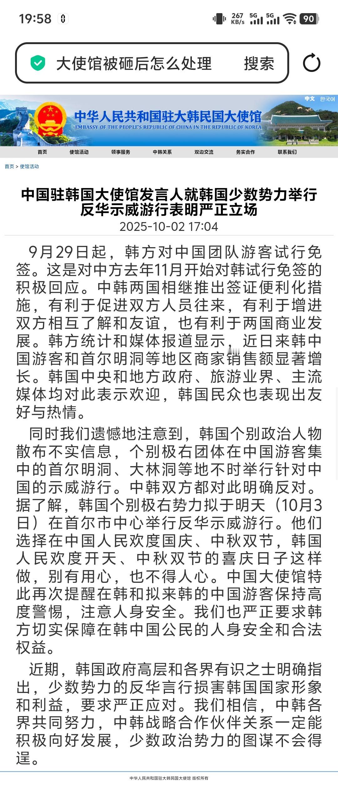 中国驻韩国大使馆严正发声提醒在韩中国游客注意人身安全中国大使馆特此再次提醒在韩和