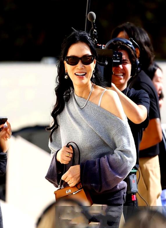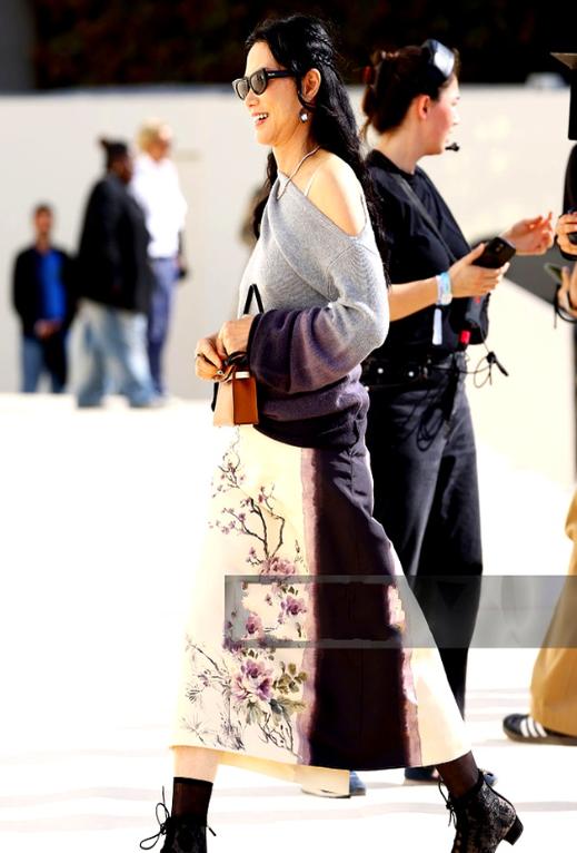 女富豪邓文迪,又飒又美!近日他去巴黎看秀,上身选择露肩款,下身配印花半身裙,一身