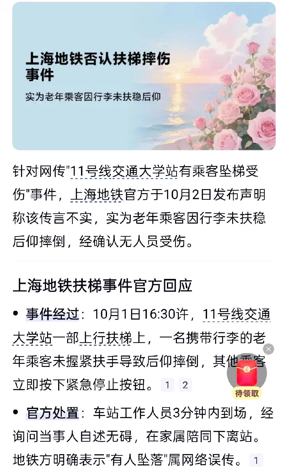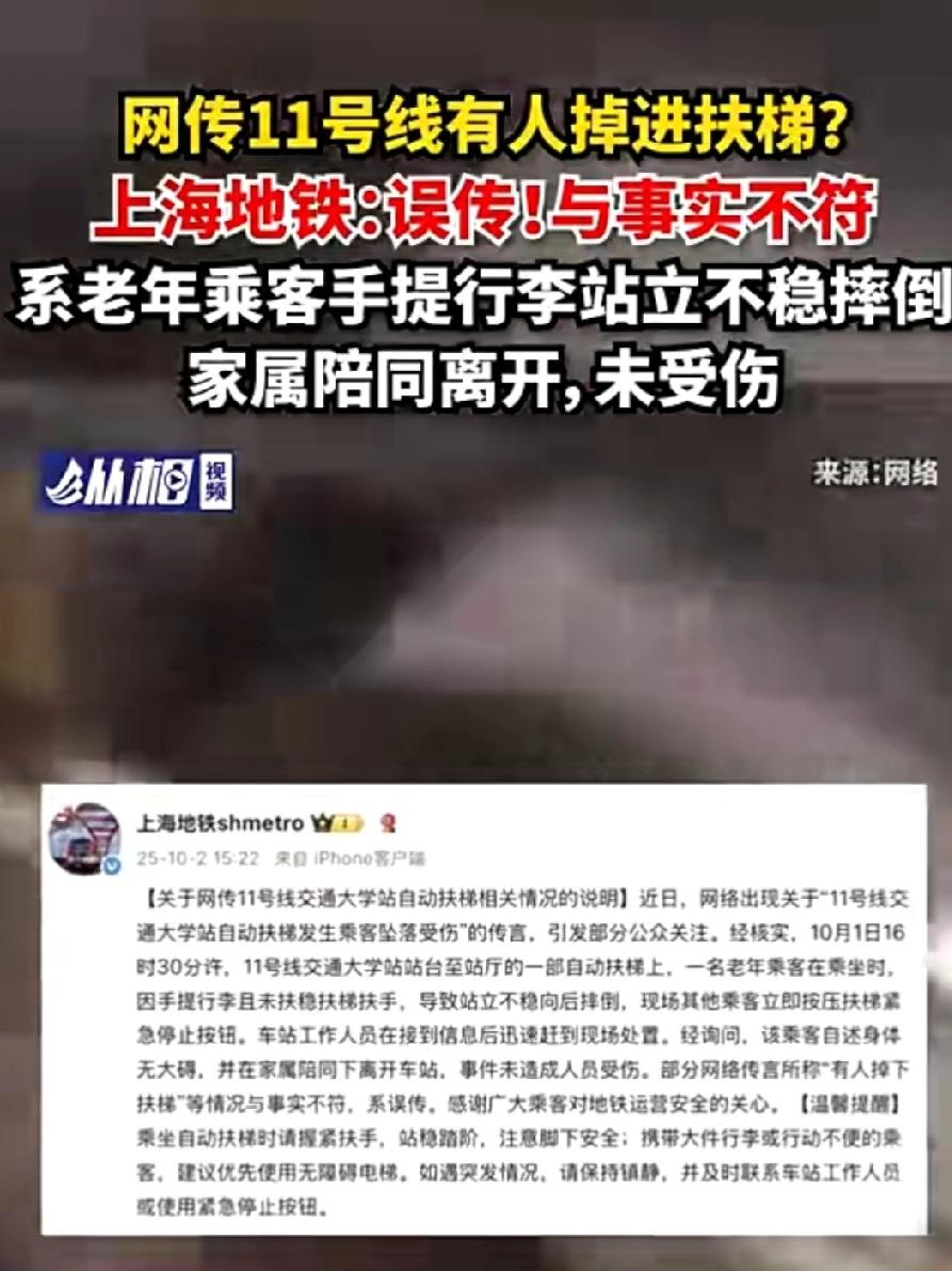 昨天下午上海地铁11号线交通大学站,说在上行扶梯有一个年轻女孩摔了。 不少人发视频说现场听到了尖叫声,甚至有人传女孩从扶梯上掉下去了。 还有媒体去问上海地铁,客服当时说是扶梯一直有第三方维护保养,他们已经把这件事登记上报,会有人跟进和处理。 到了今天,上海地铁就出了明确说明,说摔跤的根本不是女孩,而是一位老年人,因老人当时手里提着行李,没扶稳扶手才站不稳往后倒的。 还好现场有反应快的乘客,立马按了扶梯的紧急停止按钮,工作人员也很快过来帮忙,后来还问了老人 他自己说身体没事,之后跟家人一起离开了车站,全程没人受伤,之前传有人掉下去了,脚卡住了什么的,这些说法都是误传。 那些全是误传,人没事就好,也算是虚惊一场吧,地铁及时澄清点赞。上海地铁号线