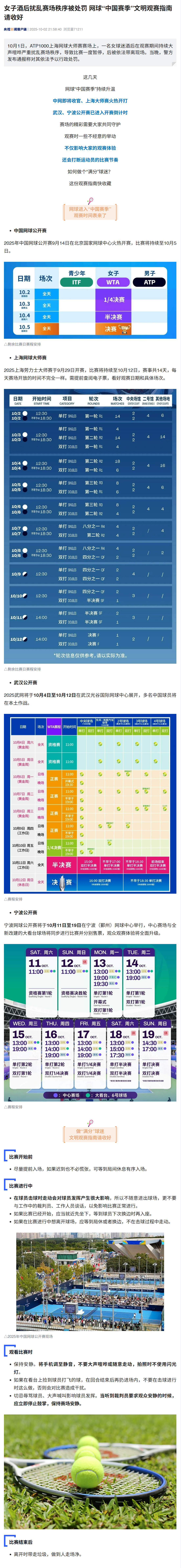 【#网球中国赛季文明观赛指南#】10月1日,ATP1000上海网球大师赛赛场上,一名女球迷酒后在观赛期间持续大声喧哗严重扰乱赛场秩序,导致比赛一度暂停,后被依法带离现场。当晚,警方发布通报称对其依法予以行政处罚。这几天,网球“中国赛季”持续升温,中网即将收官、上海大师赛火热开打,武汉、宁波公开赛已进入开赛倒计时。赛场的精彩需要大家共同守护,观赛时一些不经意的举动不仅影响大家的观赛体验,还会打断运动员的比赛节奏。如何做个“满分”球迷?这份观赛指南快收藏。